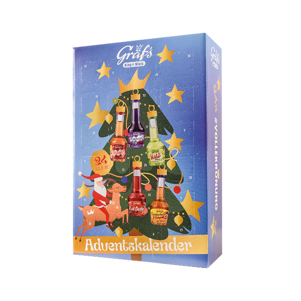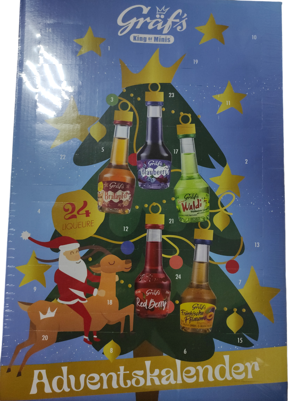 Адвент-Календар Adventcalendar Party-Minis Grafs (24 шт. х 20 мл) 480 мл Австрія Новорічний набір солодощів Adventcalendar Party-Minis Grafs Як і щороку, адвент-календар Gräfs реалізує типовий девіз бути щасливим і веселим, так що очікування свята кохання збільшується. Адвент-календар Gräfs вже одинадцятий рік дивує новими смачними лікерами. Тому що адвент-календар Gräfs завжди вигадує щось новеньке та може здивувати клієнтів новими різновидами лікеру. В адвент-календарі Gräfs на 2024 рік за кожною з 24 маленьких дверей стоїть смачний лікер. Асортимент сортується 12 разів, по 2 х 20 мл у кожному з таких сортів: 24 дверцята з 24 чудовими лікерами Грефа. 12 шт. в асортименті, по 2 шт. по 20 мл: НОВИНКА: чорниця Gräf’s 15% об. Печене яблуко Грефа 16% об. Ванільні півмісяці Грета 16% об . Gräf’s Spekulatius 16% об. Gräf’s Melon Mint* 15% об. Секс Грефа на пляжі* 16% об. Франконська слива Грефа 20% об. Gräf’s Red Berry* 16% об. Gräf’s Kleiner Waldi* 18% об. Gräf’s Party-Shooter Nussy = лікер із фундука та нуги, 18% об. Gräf’s Party-Shooter Freshy = м’ятний лікер* 18% об. Sahne Traum 17% об.