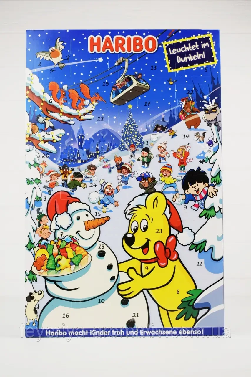 Адвент – календарь Світиться в темряві Haribo Leuchtet im Dunkelh! 300 г (24 шт.) Німеччина Адвент – календарь Haribo Leuchtet im Dunkelh! — це 24 дні захопливої гри з Вашою дитиною до настання дощу. Вивчаємо цифри та отримуємо подарунки. Придумуємо різдвяні історії й отримуємо винагороду. Все у Ваших руках, дорогі батьки, бабусі та дідуся, тіті та дядька. Влаштуйте свято Вашим улюбленим маленьким дітлахам. Різдво — це чарівне свято з подарунками та сюрпризами.