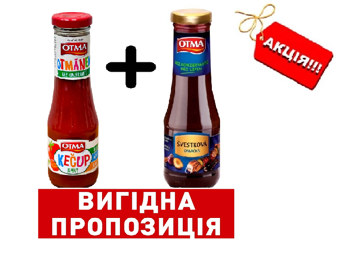 АКЦІЯ 1+1 Кетчуп дитячий томатний + Сливовий соус Otma 2х280г Чехія 1. Кетчуп дитячий томатний БЕЗ ГЛЮТЕНА Kecup Otma 280 г Чехія Кетчупи ТМ OTMA виготовляються з якісних та правильно дозрілих томатів. Вони обробляються відразу після збирання врожаю, а потім змішуються з ретельно відібраними інгредієнтами за секретним рецептом, адаптованим до смаків чеських та словацьких клієнтів. Також компанія випустила дитячий томатний кетчуп OTMA Kecup, який не містить глютен, у ньому менше солі і він солодкий на смак. Склад: вода, томати (140 г томатів на 100 г кетчупу), цукор, оцет, загусник: модифікований крохмаль, сіль, суміш спецій. 2. Сливовий соус Otma Gurmán Plum Sauce 280g Стерилізована сторона холодного соусу. Сливовий соус вирізняється солодким смаком і ароматом стиглих злив. Прекрасно поєднується зі стравами на грилі, свинячими реберцями та копченим м’ясом. Традиційний чеський бренд Otma пропонує вам томатну продукцію преміальної якості. Незалежно від того, виберете ви кетчупи, пюре, готові соуси та гарніри, стерилізовані помідори або бобові, ви отримаєте справжнє задоволення від продуктів лінійки «Відма». Відма — Поймає твій смак. Ретельно відібрані інгредієнти, без глютену.