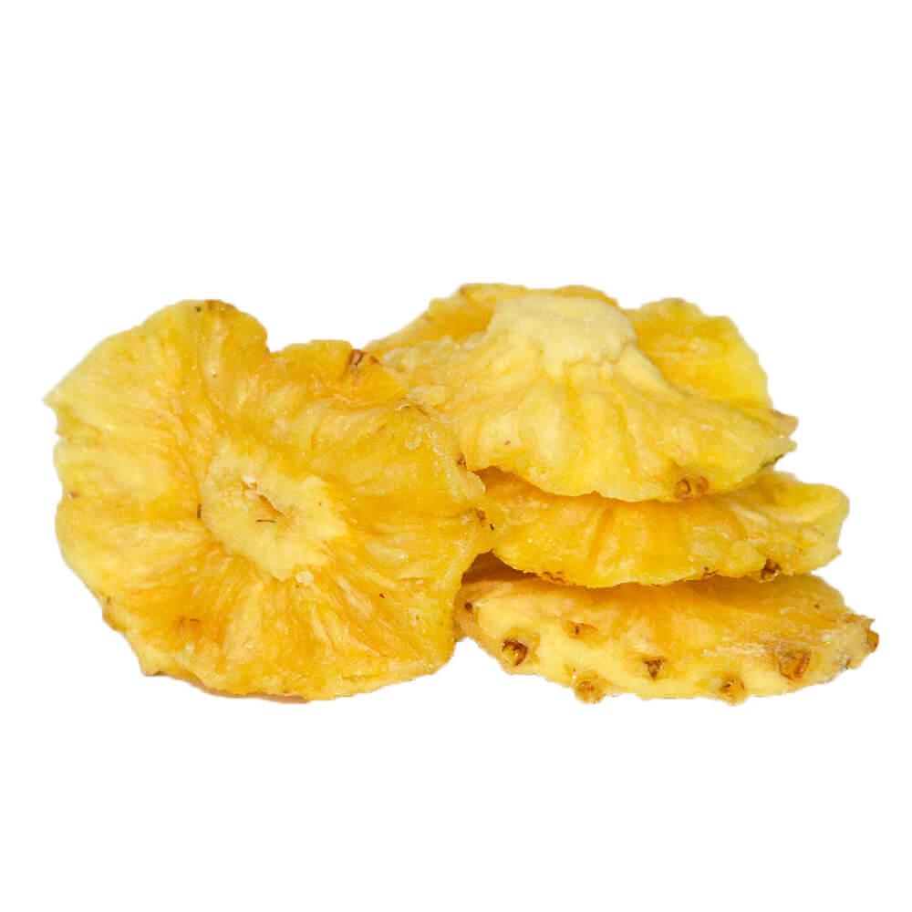 Сушені ж ананаси є джерел калію та магнію, заліза та цинку, а також вітамінів групи B і клітковини, корисні для травлення. Також сушені ананаси допомагають позбутися набряків, надають сили та покращують настрій. Сушені ананаси використовуються не тільки як закуска або снеки — з ними можна готувати різні страви, а також прикрашати випічку та кондитерські вироби.