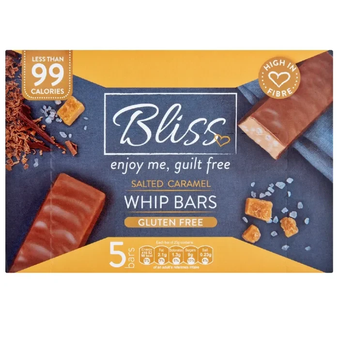 Батончик з карамеллю та печивом у молочному шоколаді БЕЗ ГЛЮТЕНУ Bliss (5х25г) 125г Великобританія Ці батончики з райською карамеллю та печивом покриті гладким молочним шоколадом. Низькокалорійний, з високим вмістом клітковини. Не містить глютен. Підходить для вегетаріанців Інгредієнти: Молочний шоколад 27% [цукор, какао-масло, незбиране сухе молоко, какао-маса, знежирене сухе молоко, емульгатори (соєвий лецитин, E476)], глюкозний сироп, цукор, наповнювач (полідекстроза), вода, волокна (інулін, бамбук), , сухе знежирене молоко, рослинні жири (пальмова олія, ядро пальмової олії), сухий яєчний білок, сіль 0,62%, барвник (карамель E150d), ароматизатори, емульгатор (лецитин соняшнику). Молочний шоколад містить щонайменше 25% сухих речовин какао, щонайменше 14% сухих речовин молока. Може містити арахіс та горіхи