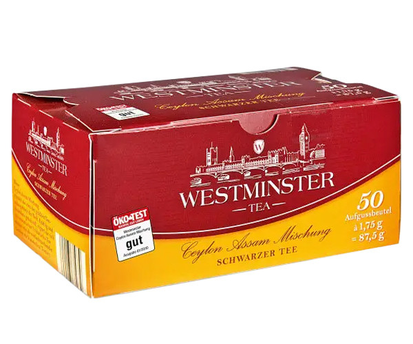 Чай ЕКО чорний Westminster (50 шт.х1,75 г) 87,5 г Німеччина Westminster Tea пакетований чорний чай, 50 шт. — це суміш чорних цейлонського чаїв. Для виробництва використовують середньолистовий чай. Виготовлений у Німеччині з чайного листя, вирощеного в Індії та Шрі-Ланці. Дуже інтенсивний і сильний аромат. Чай Вестмінстер має неповторний смак і інтенсивний аромат, легко й без проблем заварюється в чашці. Насичує енергією й має тонізувальний ефект.