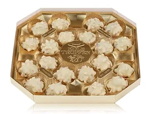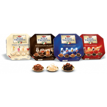 EdleTrumpf Edle Tropfen in Nuss Weisse Spezialitaten- це десерт для справжніх гурманів від німецької компанії Trumpf. Цей десерт являє собою мікс цукерок із білого шоколаду, всередині яких є один зі найсмачніших горіхів — фундук і елітний алкоголь 4 видів. Дуже ніжна текстура білого шоколаду. Аромат і смак тішать відтінками шоколаду, який добре поєднується з горіховими нотами. Посмак насичений, тривалий, яскравий. Чотири різновиди високоякісного алкоголю: ямайський ром, Kir Royal, Bellini та Daiquiri, у тонко закристалізованій цукровій корці з хрусткими осколками фундука, покриті ніжним білим шоколадом. Ці цукерки — це справжнє задоволення і смак! Спробуйте та насолоджуйтеся різними міжнародними коктейлями Pina Colada, Gin Daisy, Vodka Lemon, Daiquiri. Алкоголь 4,8%.