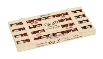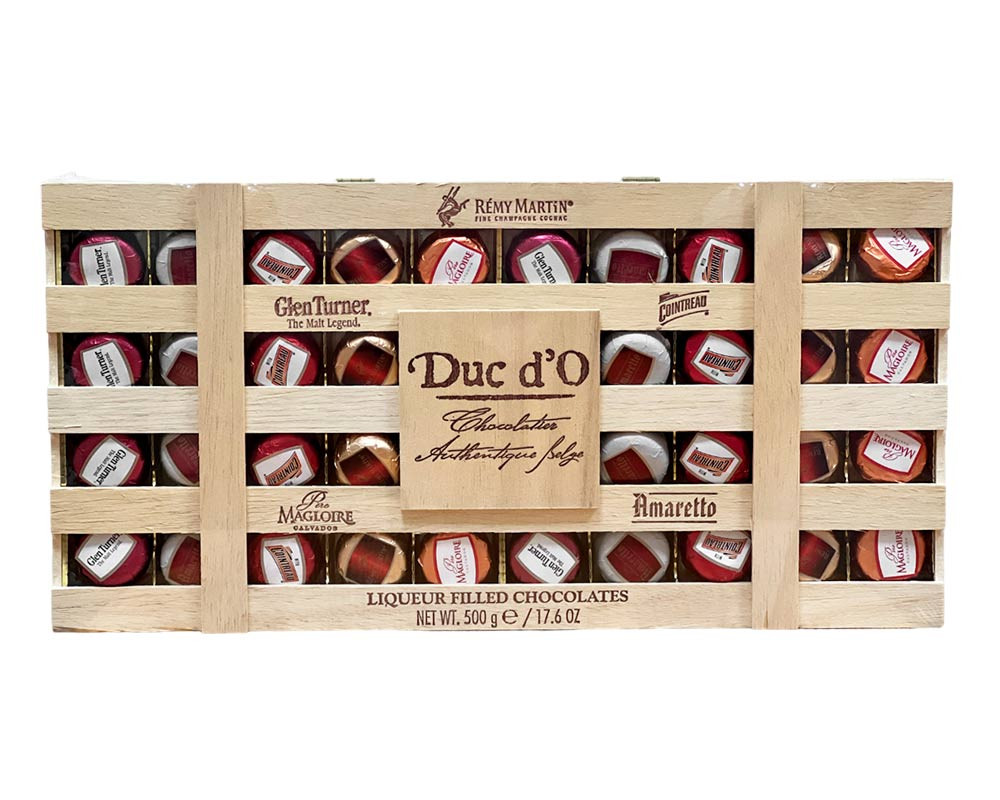 Цукерки з лікерами 5 смаків Remy Martin Duc d’O Liqueurs 500 г Бельгія Цукерки в цій елегантній подарунковій дерев’яній коробці — це справжня насолода, оскільки кожна цукерка виготовлена з високою майстерністю, використовуючи найкращі інгредієнти. Цукерки з темного та молочного бельгійського шоколаду з лікерами: – Glen Turner – Amaretto – Cointreau – Remy Martin – Magloire