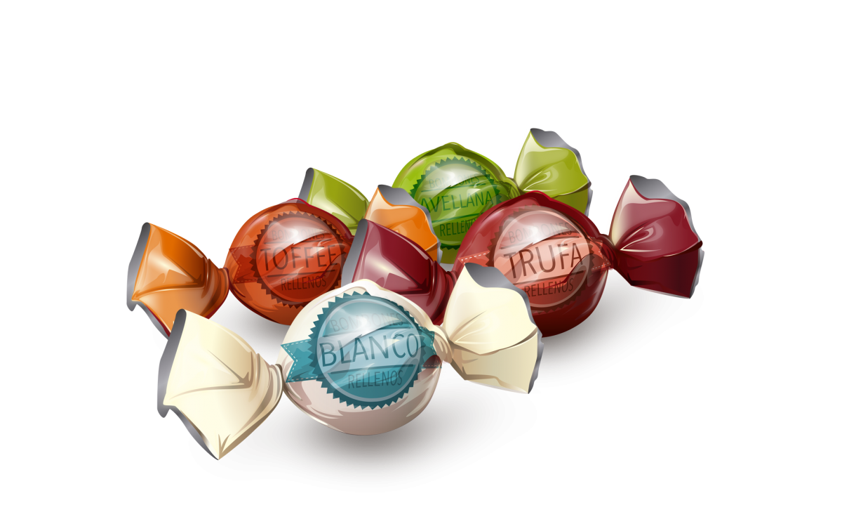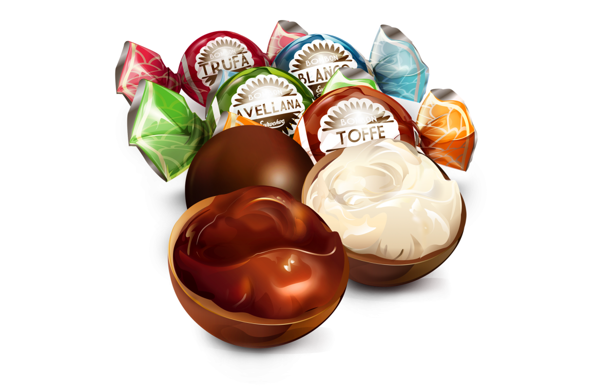 Цукерки з молочного шоколаду Асорті БЕЗ ГЛЮТЕНА Eurochoc Esferas Doble Fleco 1кг Іспанія Асорті Eurochoc Esferas Doble Fleco — чотири різновиди цукерок із молочного шоколаду з начинкою з молочного крему, крему з фундука, крему зі смаком трюфелю та крем зі смаком карамелі. Склад: 50% молочний шоколад: цукор, какао-олія, сухе суцільне молоко, какао терте, суха сироватка, зневоднений молочний жир, емульгатор: соєвий лецитин (Е-322) й ароматизатор ванілі. 50% начинка: цукор, рослинні жири та олії в змінних пропорціях (пальмова, пальмоядрова, кокосова та соняшникова), суха сироватка, какао-порошок знежирений (6%), сухе знежирене молоко (3%), фундук (0,5%), емульгатор: соєвий лецитин (Е-322) й ароматизатори. Вміст какао в молочному шоколаді не менш ніж 30%. Не містить глютену.