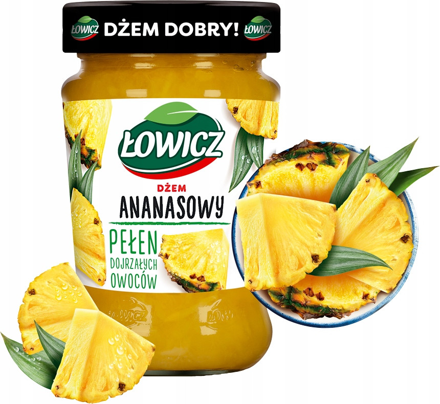 Джем з ананасу з низьким вмістом цукру Lowicz 280г Польща Джем Łowicz відрізняється незмінно високою якістю, великою кількістю шматочків фруктів, натуральним смаком, кольором та ароматом. Він виготовлений із найкращих фруктів і має знижений вміст цукру. Він не тільки смачна добавка до страв та хліба, а й джерело вітамінів. Аромат ананаса надає дуже несподіваного результату. Джем містить шматочки фруктів. Він має неповторний смак, колір та аромат. Склад: ананаси (37%), вода, цукор, желюючий агент – пектини, загусник – гуарова камедь, регулятори кислотності – лимонна кислота