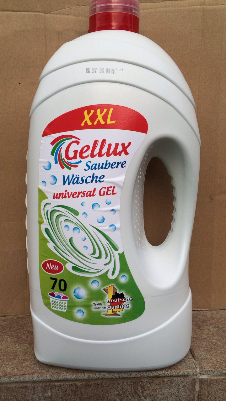 Гель для прання Gellux Universal — високоякісний мийний засіб призначений для білої та кольорової білизни. Він містить необхідні компоненти, які дадуть змогу неабияк поліпшити якість прання за мінімального використання прального порошку. З легкістю відпирають усі типи забруднень від соусу, кетчупу, йогурту, соку, крові. Гель для прання Gellux Universal додасть вашій білизні м’якість і захистить волокна тканини від раннього зношування. Можливе застосування для різних типів тканин. Для прання в пральній машині будь-якого типу, а також для ручного прання. Gellux Universal містить спеціальні компоненти, що дають змогу захищати Вашу пральну машину від утворення накипу та вапняного нальоту. Не містить фосфатів. 70 прань