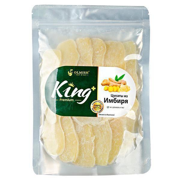 Імбир цукати OLMISH 500 г (1уп.х 40 шт.) Імбир у цукровій пудрі — пікантна закуска. Розм’якшене коріння рослини Zingiber просякнуті цукром. У делікатесу терпкий солодкий смак із пряним відтінком. Імбир багатий на крохмаль, ліпіди, мінерали, вітаміни. Засіб допомагає у разі розладів шлунка, нудоти, викликаної морською хворобою, хімієтерапією. Імбирні цукати заспокоюють слизові дихальні шляхи та допомагають кинути курити.