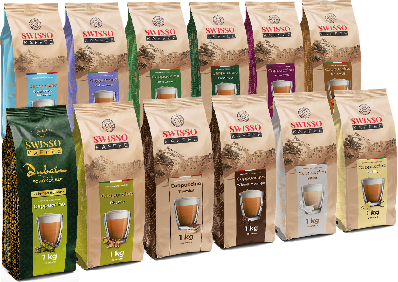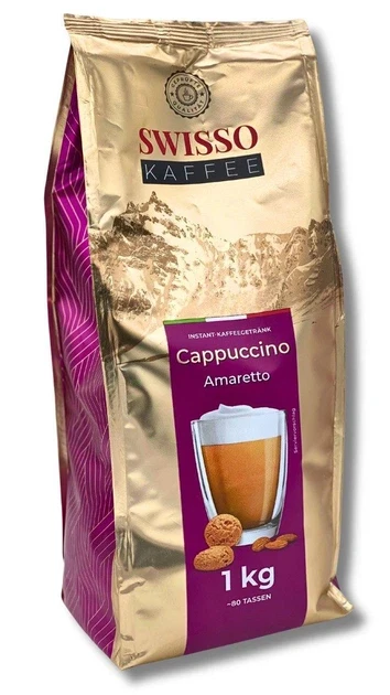 Капучіно зі смаком Амаретто Swisso Kaffee Cappuccino Amaretto 1кг Німеччина Цей чудовий напій готується змішуванням розчинної кави, солодких вершків та цукру. Просто додайте воду. Завдяки простому способу приготування, капучіно Swisso можна приготувати за лічені секунди, як у найкращих кафе світу. Широкий вибір смаків капучіно Swisso гарантує незабутні враження.