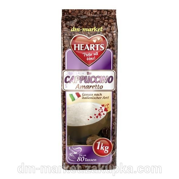 Капучино Hearts Amaretto — чудове капучино зі смаком вишуканого лікеру Амаретто. Напій має густу консистенцію, п’янкий стильний аромат, високу оксамитову пінку та смак справжнього італійського каппучино.