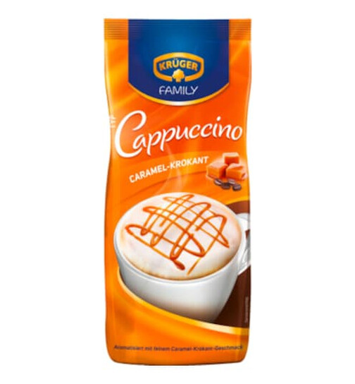 Бренд гарячих напоїв Kruger має популярність не тільки в Німеччині, але й у багатьох інших країнах ЄС. Щоб отримати таку популярність, виробник використовує тільки натуральну сировину, що робить капучино натуральним і смачним. Щоб приготувати капучино, Вам необхідно залити гарячою водою 3 чайні ложки сухої суміші, перемішати, після чого напій буде готовий до вживання. Прикрасьте пінку, посипавши, через трафарет розчинним сухим капучино, як це показано на картинці.