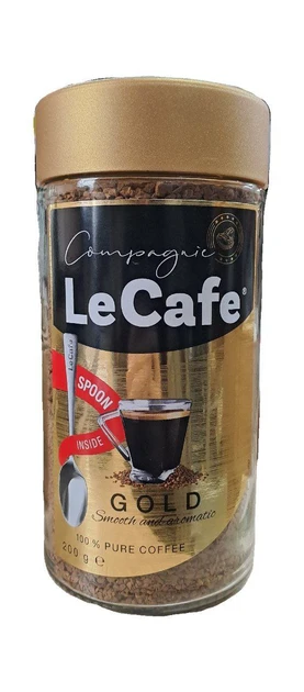 Кава розчинна з ложкою Compagnic LE CAFE GOLD 200г Польща Le Cafe Gold – це чудова розчинна кава, виготовлений за найсучаснішою технологією сублімації. При цьому кава зберігає у складі кофеїн і більшість натуральних корисних речовин, смак та аромат готового напою стає більш вираженими. Розчинна кава Le Cafe Gold – це неймовірне поєднання обсмажених зерен арабіки та робусти. Свіжозаварений напій має м’який і насичений смак, приємний аромат та дивовижний післясмак. Виготовляється за спеціальною технологією – кавові боби спочатку варять, потім заморожують та сублімують.Завдяки цьому вдається створити неймовірний купаж смаку та аромату. Купити розчинну сублімовану каву Le Cafe Gold у скляній банці, яка щільно закривається можна для себе або як доповнення до презенту.