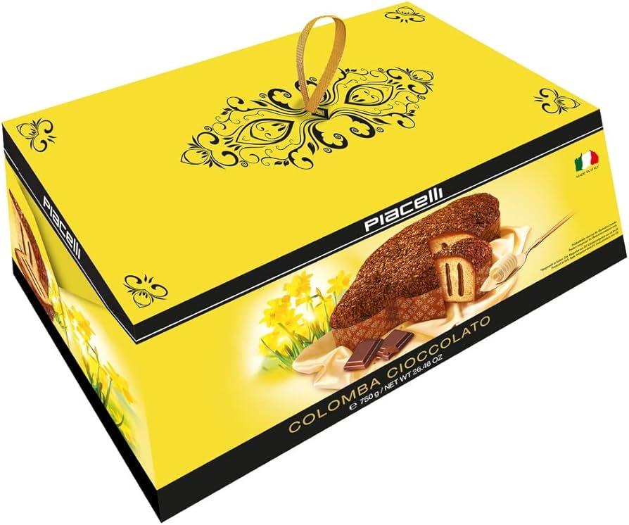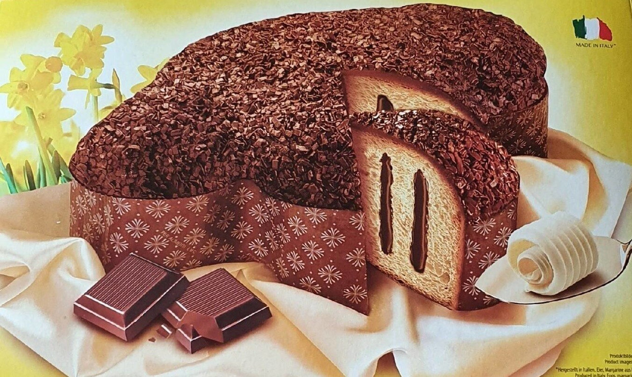 Кекс (Панеттоне) із шоколадним кремом Piacelli Colomba Cioccolato 750г Австрія Солодкий дріжджовий пиріг з шоколадною глазур’ю та шоколадним кремом. Може містити сліди мигдалю, фундуку, гірчиці та сої. Пшеничне борошно, цукор, пастеризований шоколадний крем (глюкозний сироп, вода, цукор, шоколад 8% (цукор, какао-порошок, какао-олія), декстроза, олія, сухе знежирене молоко, спирт, ароматизатори, желюючий агент: пектин; консерванти : сорбат калію; сіль), маргарин 9% (пальмовий жир, вода), натуральні дріжджі (пшеничне борошно, вода), какао-покриття (цукор, цільний гідрогенізований рослинний жир (пальмоядрове), знежирений какао-порошок 16% соняшнику; ароматизатор), какао-пластівці (цукор, цілісні гідрогенізовані рослинні жири (пальмоядрове, соняшникова олія), знежирений какао-порошок 16%, емульгатор: лецитин соняшника; глюкозний сироп, ароматизатор), яєчний жовток, дим кислот; сіль, олія 0,3% (з молока), сухе знежирене молоко, ароматизатори.