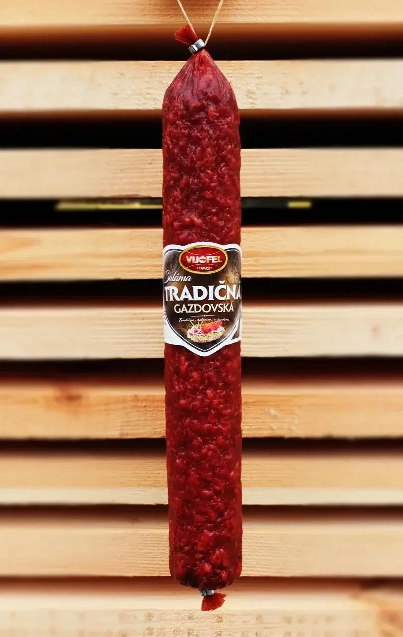 0% – СОЇ 0% – ГЛЮТЕНУ 1Tradicna gazdovska — це сирокопчена ковбаса, яка володіє пряним запахом і приємним солонуватим смаком. Вона ідеально підходить для приготування різноманітних салатів і закусок, супів і других страв.Tradicna gazdovska — це сирокопчена ковбаса, яка володіє пряним запахом і приємним солонуватим смаком. Вона ідеально підходить для приготування різноманітних салатів і закусок, супів і других страв.