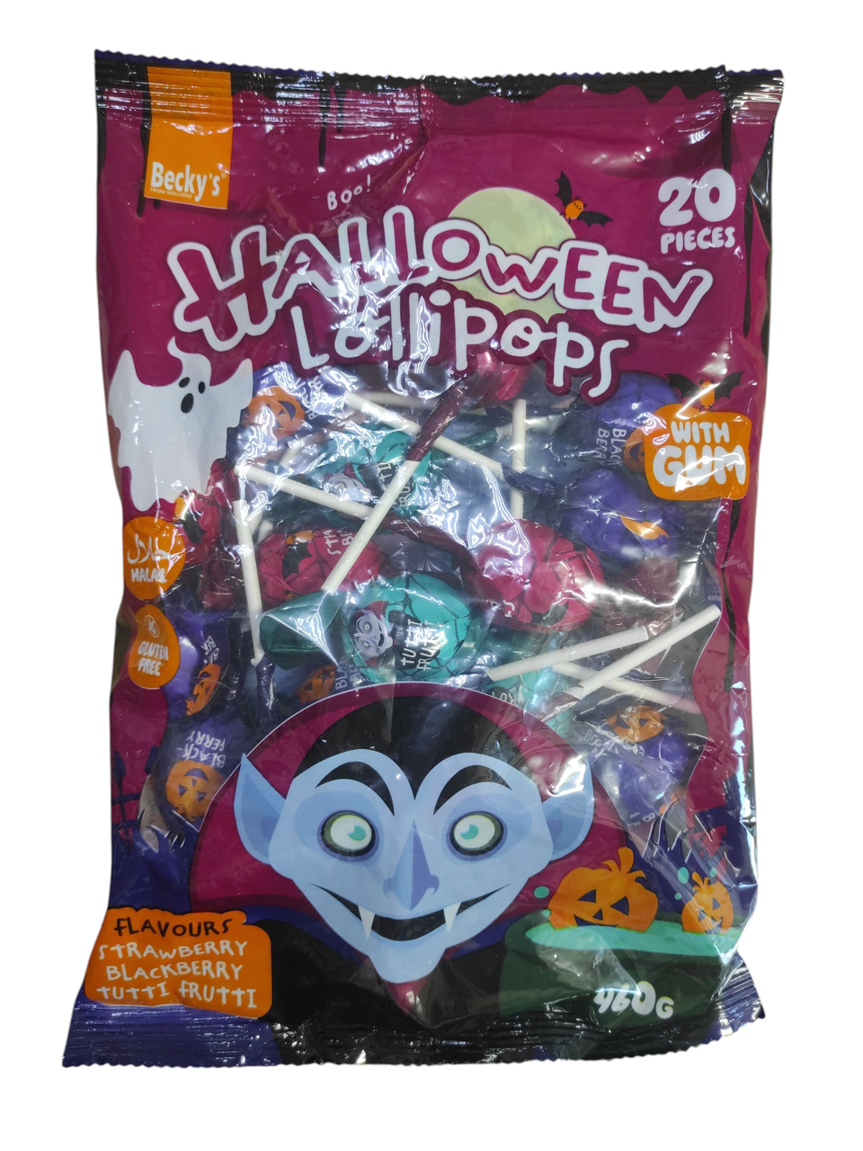 Льодяники на паличці БЕЗ ГЛЮТЕНА HALLOWEEN Lollipops (полуниця, чорниця, тутті-фрутті) (20х23г) 466 г Нідерланди Льодяники на паличці з жуйкою — це солодкість, що являє собою карамельний льодяник із жувальною гумкою в центрі, насаджений на паличку. Такі цукерки поєднують у собі дві текстури: спочатку насолода смачною карамеллю, а потім — довгогральну жуйку. Вони виробляються різними брендами, наприклад, Roshen і Argo, і можуть мати різноманітні фруктові та інші смаки.