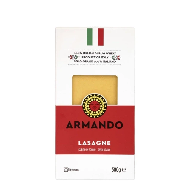 Макаронні вироби Лазанья Armando Lasagne 500г Італія Armando Lasagne – це італійські макаронні вироби у формі широких листів, призначені для приготування класичної лазаньї. Бренд Pasta Armando позиціонує свою продукцію як преміальну пасту зі 100% італійської твердої пшениці, вирощеної в рамках суворого контролю ланцюжка поставок (filiera).Листи не вимагають попереднього відварювання перед запіканням, що спрощує процес готування.