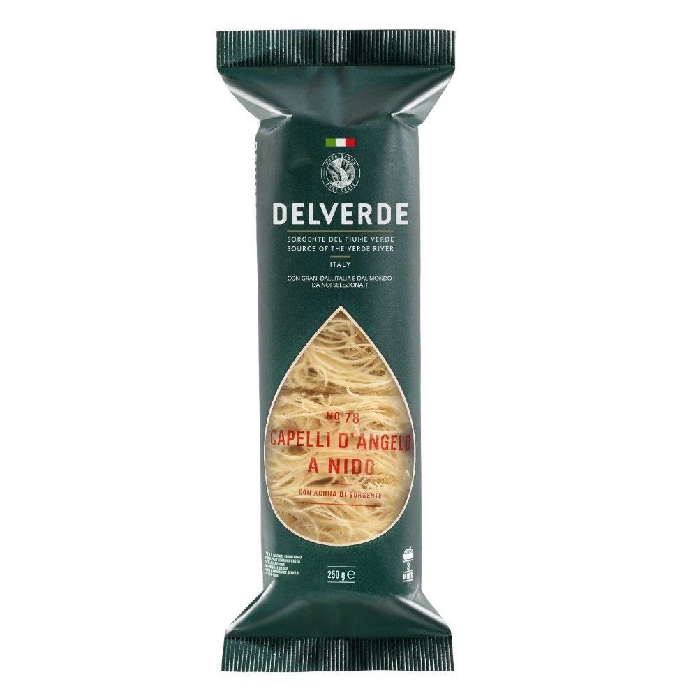 Макарони-гнізда “Волосся Ангела” Delverde Capelli D’Angelo a Nido №78 250г Італія Delverde Capelli D’Angelo a Nido №78 — це високоякісна італійська паста у формі тонкого «ангельського волосся», згорнутого в порційні «гнізда». Макарони, приготовані з чистої джерельної води та ретельно відібраної манної крупи із твердих сортів пшениці, в основному з Італії та з усього світу. Груба екструзія та повільна сушка при низьких температурах надають цим макаронам унікальних властивостей, забезпечуючи чудові кулінарні якості, ідеальну текстуру та консистенцію «аль денте». Ідеально підходять для порціонування. Спробуйте їх як макарони в бульйоні, супах або овочевих пюре.