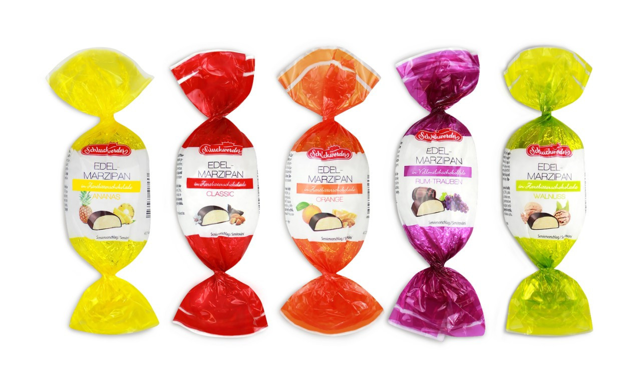 Марципан Edelmarzipan Schluckwerder 5 смаків 100 г Німеччина Марципан – це ласощі з подрібненого мигдалю та цукрової пудри. Основний компонент марципана – це мигдаль, тому відомо, що крім такого смаку, марципан володіє унікальними властивостями, містить корисні вуглеводи, вітаміни В і Е, протеїни, магній, калій, кальцій, фосфор і залізо. Ранок з поєднанням солодкого, але не приторного мигдалевого ласощі і чаруючого терпкої кави приносить енергію, заряд бадьорості і дарує потік позитивних емоцій на весь день.