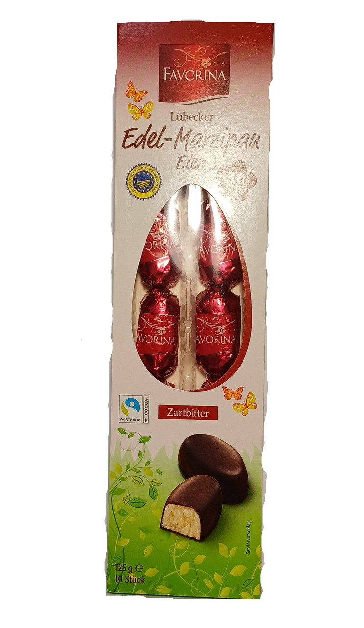 Марципанові яйця в чорному шоколаді (конфети) Favorina Edel-Marzipan Eier Zartbitter 125 г Німеччина Марципан Marzipan — це ласощі з подрібненого мигдалю та цукрової пудри. Основний компонент марципана — це мигдаль, тому відомо, що, крім такого смаку, марципан має унікальні властивості, містить корисні вуглеводи, вітаміни В і Е, протеїни, магній, калій, кальцій, фосфор і залізо. Ранок із поєднанням солодкого, але не нудотного мигдального ласощів і чарівної терпкої кави приносить енергію, заряд бадьорості та дарує потік позитивних емоцій на весь день.