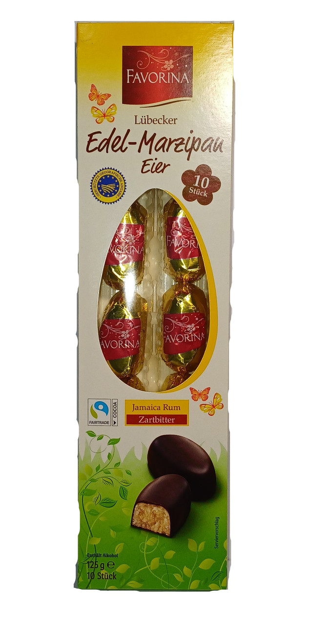Марципанові яйця з ром у чорному шоколаді (конфети) Favorina Edel-Marzipan Eier Jamaica Rum 125 г Німеччина Марципан Marzipan — це ласощі з подрібненого мигдалю та цукрової пудри. Основний компонент марципана — це мигдаль, тому відомо, що, крім такого смаку, марципан має унікальні властивості, містить корисні вуглеводи, вітаміни В і Е, протеїни, магній, калій, кальцій, фосфор і залізо. Ранок із поєднанням солодкого, але не нудотного мигдального ласощів і чарівної терпкої кави приносить енергію, заряд бадьорості та дарує потік позитивних емоцій на весь день.