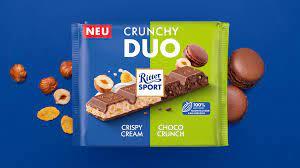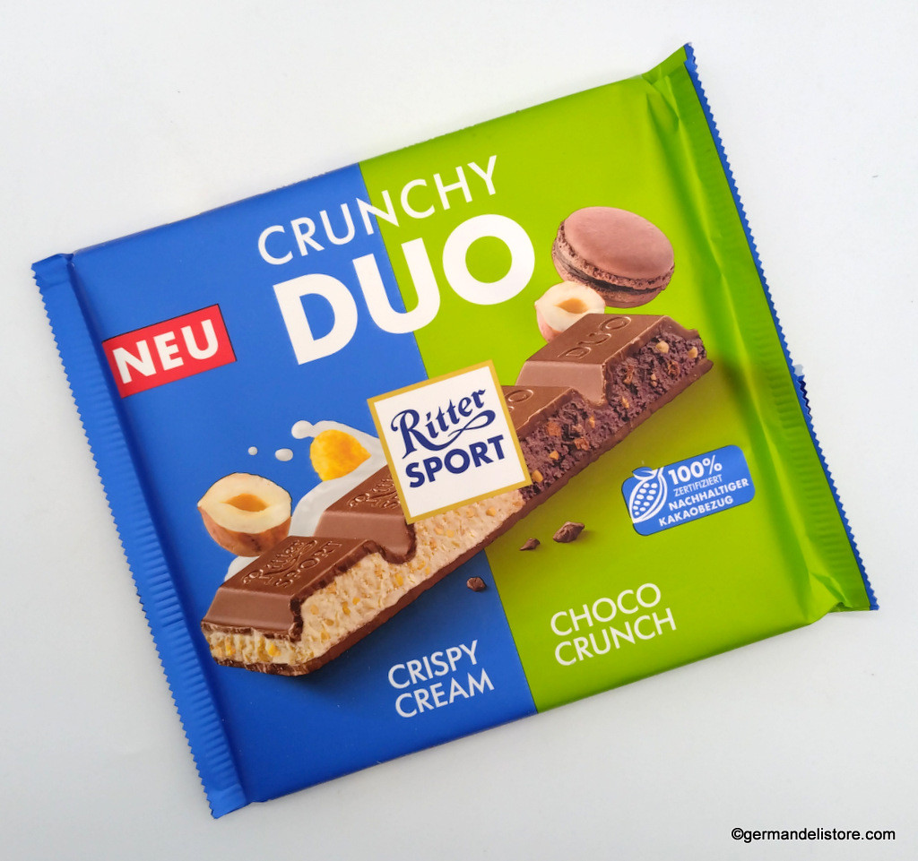 Молочний шоколад Ritter Sport Crunchy Duo 218г Німеччина Двоє закоханих один одного: CRISPY CREAM і CHOCO CRUNCH. Смачний горіховий крем та хрумкі кукурудзяні пластівці з одного боку, насичений какао-крем з хрумкими макаронами та шматочками смаженого фундука з іншого боку. Іншими словами: просто смачно і подвійно хрумка.