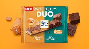 Молочний шоколад Ritter Sport Sweet’n Salti Duo 218г Німеччина DUO – це нова лінійка продуктів Ritter Sport, що поєднує два сорти в одному батончику. CARAMEL CRUSH: молочний шоколад з начинкою із чудового карамельного крему та шматочками солоного масляного печива. BIG BROWNIE: молочний шоколад із начинкою з насиченого какао-крему для брауні.