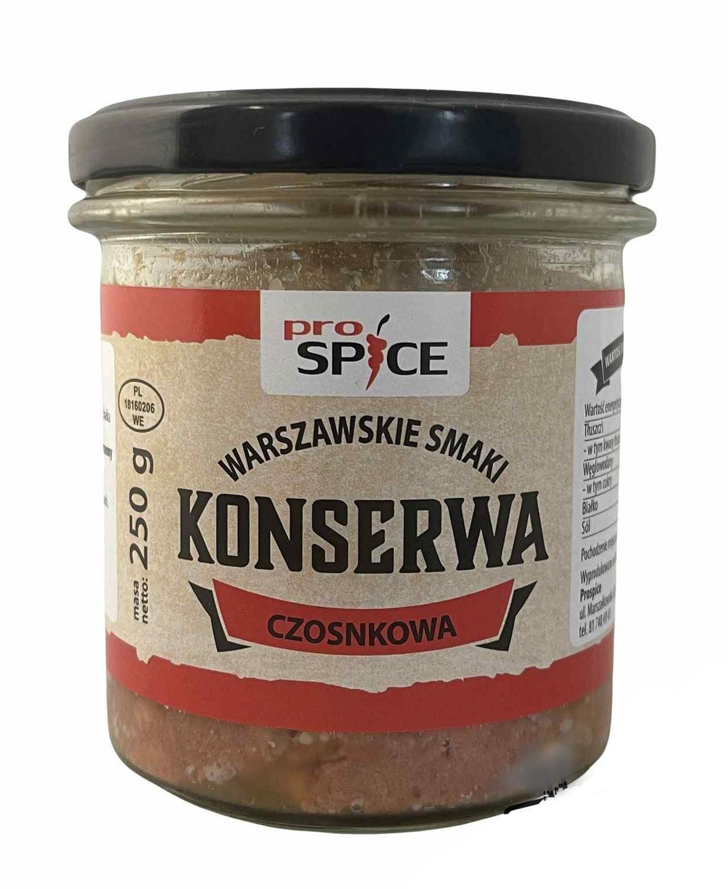 М’ясо свиняче стерилізоване з часником Warszawskie Smaki Konserwa Czosnkowa 250г Польща Консерва м’ясна Warszawskie smaki свинина з часником 250г. – це середнього помелу свинина до 61% з додаванням спецій та часнику. У кулінарії достатньо додати тушонку в кінці приготування і Ваша страва стане не тільки ситною, а й дуже смачною. Якщо ви не використовували відразу все тушковане м’ясо, ви без проблем закриєте її кришкою, що закручується, для зберігання в холодильнику. Скляна банка не тільки забезпечує довге зберігання тушонки, але й зберігає всі смакові якості продукту. Ви завжди можете зберігати пару баночок про запас просто на полиці кухонної шафи. Смачного!