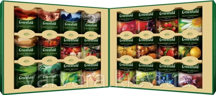 Набір із 24 сортів чаю Greenfield «Premium Tea» 167,2 г Набір чаю, який зробить кожен ваш день особливим і неймовірним. Урізноманітніть ваше життя різними неймовірними смаками й ароматами. Рідкі сорти чорного та зеленого листового чаю з найкращих плантацій Цейлону, Індії, Китаю та Китаю, вишукані чайні композиції з запашними травами, ягодами, фруктами, пелюстками квітів і прянощами.