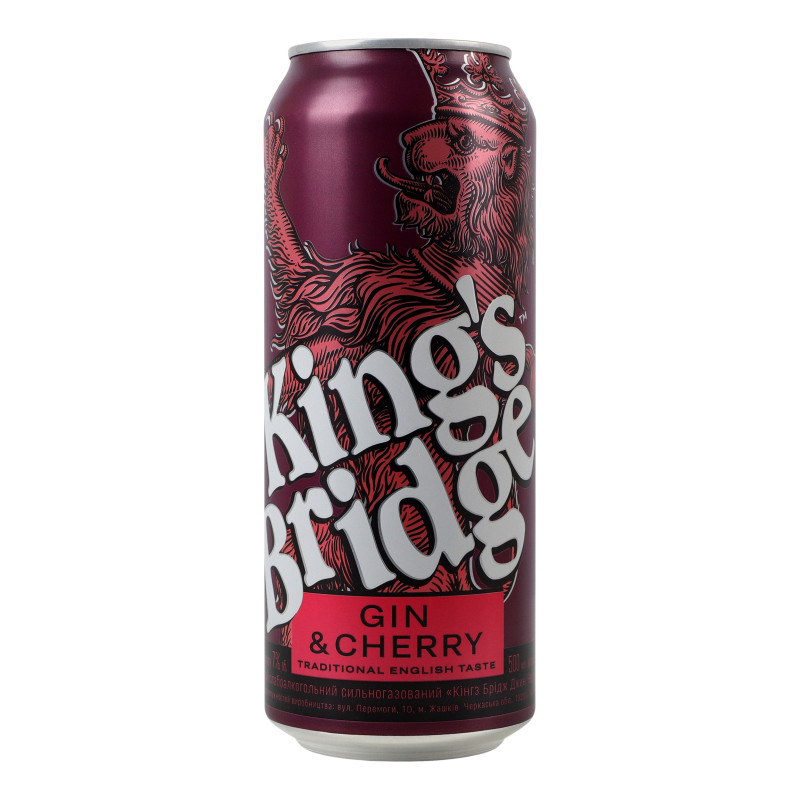 Напій слабоалкогольний King’s Bridge Gin&Cherry 7% 500 мл Україна King’s Bridge вишня — це слабоалкогольний газований напій із смаком і ароматом вишні, створений на основі джину King’s Bridge та натурального вишневого соку. Напій має солодкуватий смак із легкою вишневою кислинкою та ягідним посмаком.