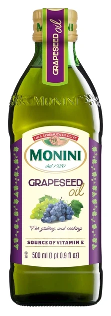 Олія рафінована з виноградних кісточок Monini Grapeseed Oil 500мл Італія Італійська компанія Monini виробляє рафіновану олію з виноградних кісточок, яка цінується за нейтральний смак і універсальність у кулінарії та косметології. Завдяки високій температурі димлення (близько 160-216 ° C) воно ідеально підходить для смаження, грилю та фритюру, не перебиваючи природний смак продуктів.Олія Monini Grapeseed Oil виходить шляхом екстракції з виноградних кісточок з подальшим очищенням, що робить його практично безбарвним і позбавленим запаху. У кулінарії використовується для приготування маринадів, заправок для салатів, майонезу, а також для гасіння та обсмажування м’яса, птиці та овочів. У косметології, завдяки високому вмісту вітаміну E та антиоксидантів олія застосовується для харчування та відновлення витонченої чи сухої шкіри.