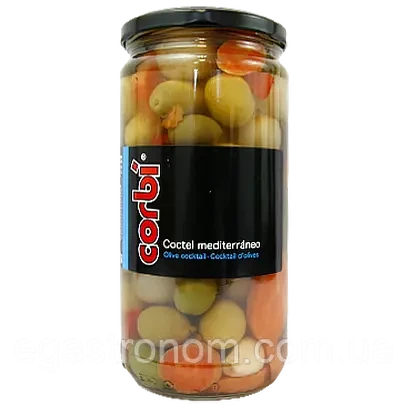 Оливки коктейль Corbi Coctel Mediterraneo 835г Іспанія Оливки Corbi Coctel Mediterraneo – це маринована іспанська оливка з додаванням шматочків моркви, огірка, цибулі та найсмачніших маслин, що надає неймовірний смак та пікантний післясмак. Ідеальні для салатів, закусок або як окрема страва. Насправді оливки – це універсальний плід, що поєднується з різними закусками, гарячими стравами та напоями. Встановлено, що щоденне вживання оливок знижує ризик розвитку захворювань серцево-судинної системи, зменшується ймовірність інфарктів та раку. Речовини, які у оливках, зупиняють старіння організму. Оливки кладуть у салати, ними прикрашають мініатюрні бутерброди з пікантними або плавленими сирами та шинкою. Чорні оливки найкраще підходять до м’яса, зелені до холодних рибних страв. Гарні оливки та як гарнір. Рибним, м’ясним, овочевим стравам, соусам та супам вони надають пікантного смаку. Дуже популярні коктейлі з оливками.