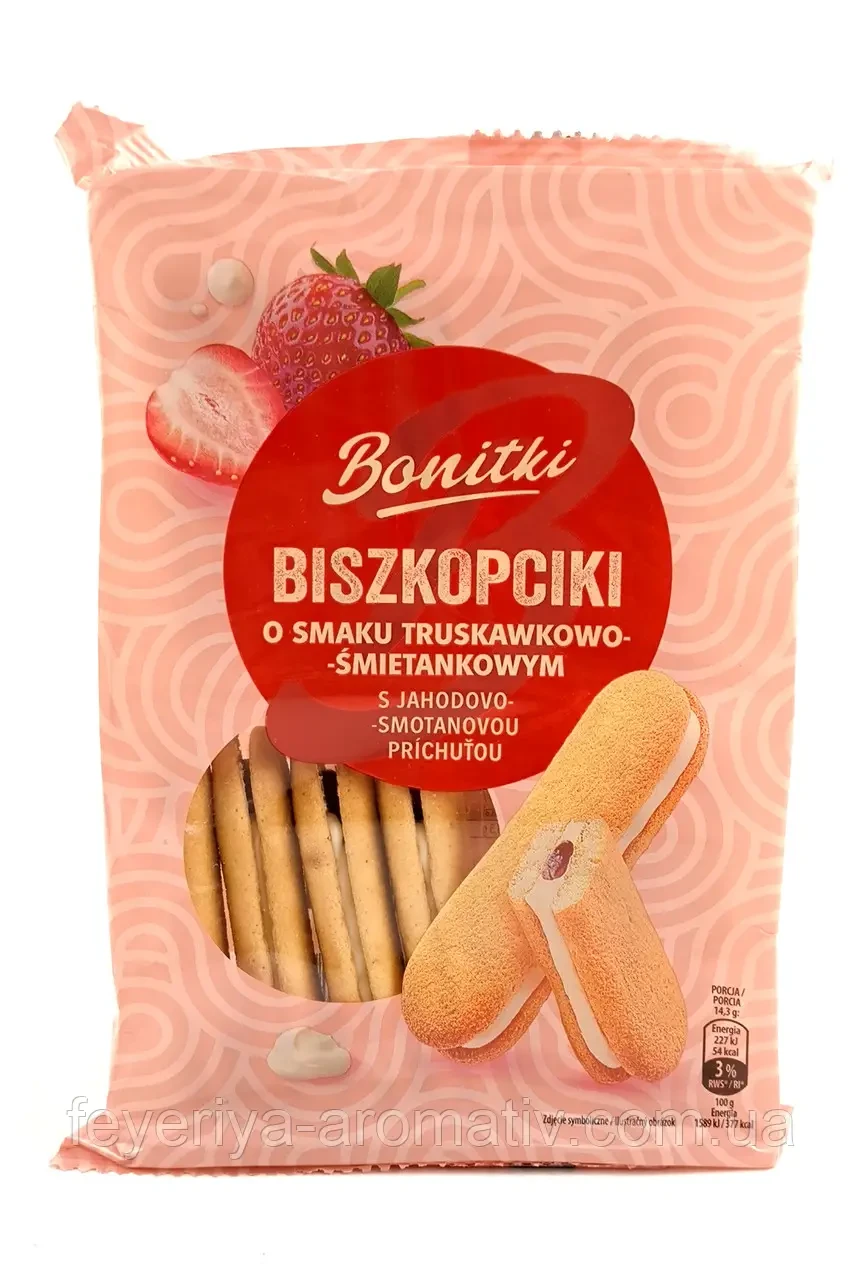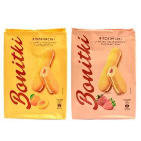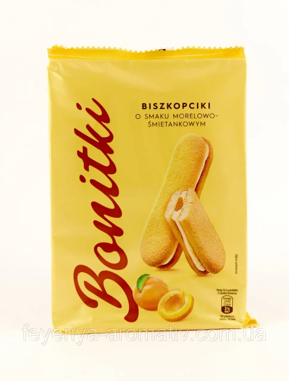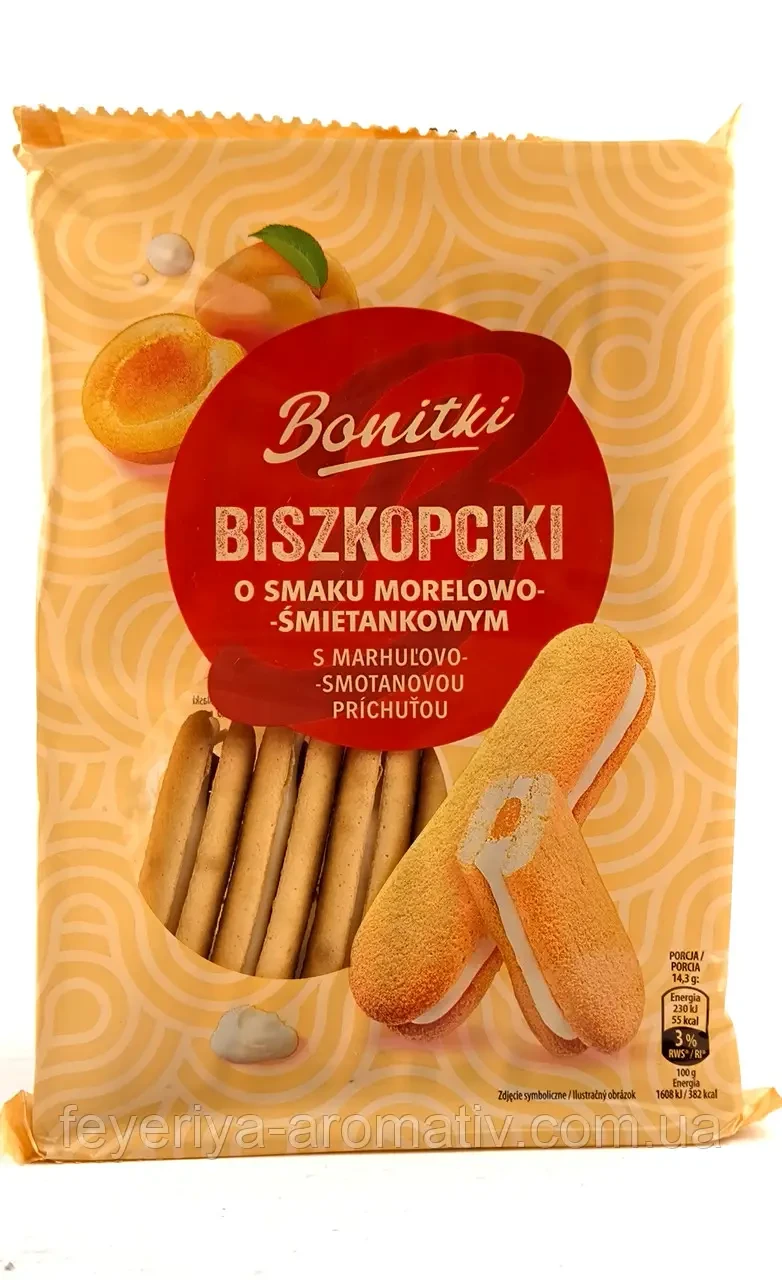 Печиво бісквітне з вершково-абрикосовою начинкою Bonitki 170 г Польща Опис Печенье Bonitki со вершково-абрикосової — це смачне печиво з хрусткою текстурою й ніжною начинкою із поєднання вершкового крему та полуничного варення. Воно має солодкий і освіжний смак. Печенье Bonitki со вершково-абрикосової начинкою виготовляється з якісних інгредієнтів, включно з пшеничним борошном, вершковиною, цукром, вершками, полуничним варенням та іншими натуральними добавками. Вершковий крем надає печивю оксамитність і м’якість, а полуничне варення додає свіжості та фруктового аромату. Це печиво має привабливий зовнішній вигляд і чудово поєднується з чашкою чаю або кави. Воно може бути чудовим десертом або солодким частуванням на будь-який випадок.
