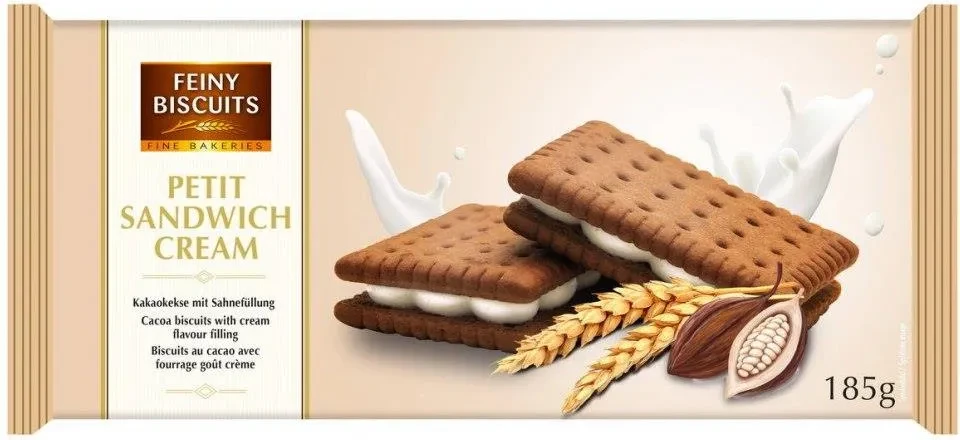 Печиво-сендвіч з какао та вершковим кремом Feiny biscuit Petet sandwich cream 185г Австрія Feiny biscuit Petet sandwich cream від всесвітньо відомого австрійського виробника. Компанія протягом багатьох років займається виробництвом кондитерських та шоколадних виробів. Для приготування продукції виробник використовує виключно добірні та високоякісні компоненти, завдяки чому її продукція користується величезним попитом та популярністю на світовому ринку. Хрумке печиво з какао з’єднані між собою ніжним вершковим кремом.Печиво чудово поєднується не тільки з чаєм, але і з кавою, соком, молоком і навіть какао. Воно не тільки мега апетитне, але ще й корисне.