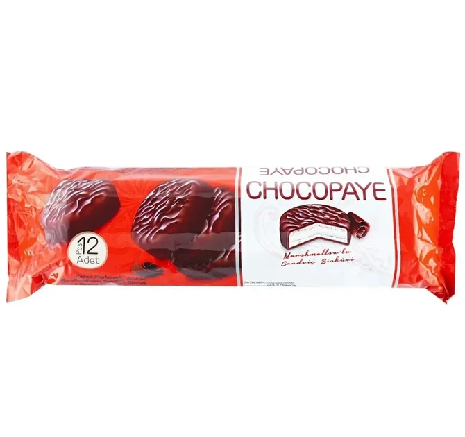 Печиво-сендвіч з маршмеллоу у темному шоколаді Simsek Chocopaye 216г Туреччина Печиво Simsek Chocopaye – це пісочне печиво з ніжним м’яким прошарком маршмеллоу, вкрите ароматним темним шоколадом. Вранішню каву або вечірній чай приємно випити з цим печивом. Воно тане в роті і залишає солодкий післясмак. Печиво упаковано в зручну практичну ванну з кришкою і в пакет, яку завжди можна взяти з собою на природу, прогулянку.