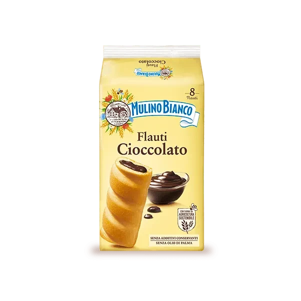 Печиво Шоколадні Трубочки БЕЗ ПАЛЬМОВОГО ОЛІЇ MulinoBianco Flauti Cioccolato (8х35г) 280г Італія MulinoBianco Flauti Cioccolato – це бісквітне печиво з шоколадною начинкою. Воно складається з м’якого бісквіту та шоколадного крему з фундуком. Не містить пальмової олії, барвників, консервантів, гідрогенізованих жирів та ГМО інгредієнтів.