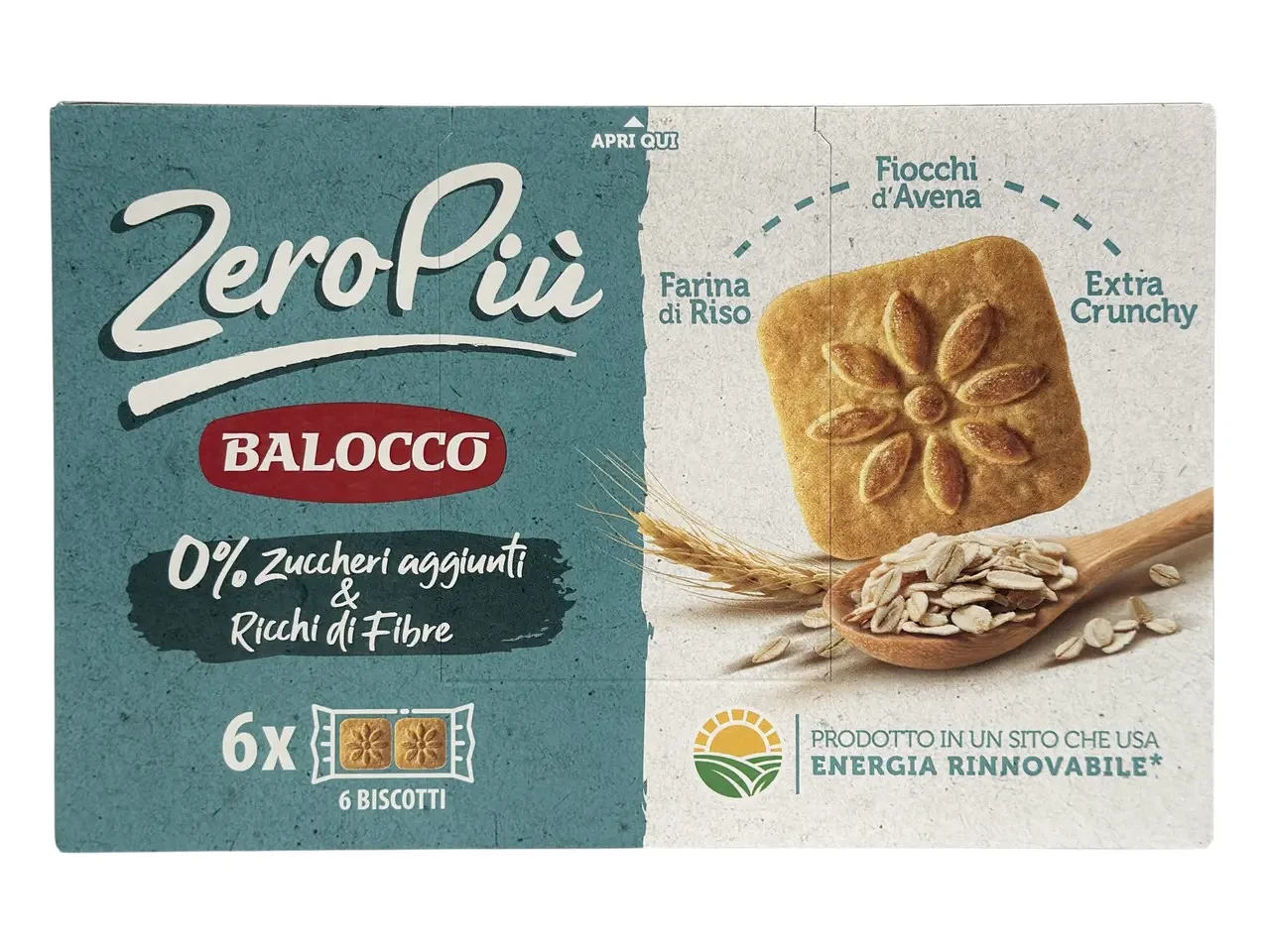 Пісочне печиво з вівсяними пластівцями БЕЗ ЦУКРУ Balocco Zero Piu Fiocchi d’Avena (6*38,3г) 230г Італія Balocco ZeroPiù Fiocchi d’Avena & Farina di Riso – це хрумке печиво з лінійки продуктів для здорового харчування, орієнтованої на відсутність доданого цукру і високий вміст клітковини.Основними інгредієнтами є пшеничне борошно (52%), підсолоджувачі (мальтит), соняшникова олія, хрусткі злаки (рис та пшениця), свіжі яйця, рисове борошно (3,2%) та вівсяне борошно (3,2%).