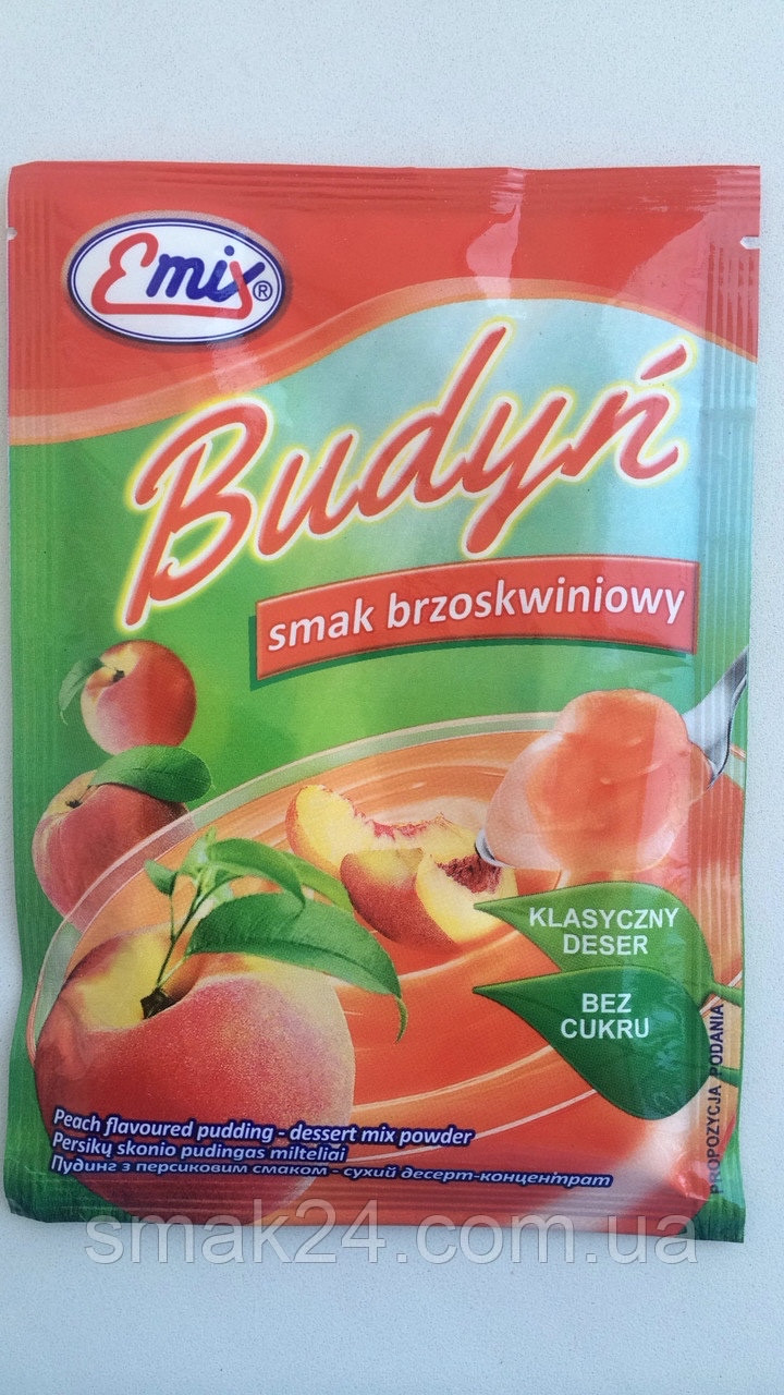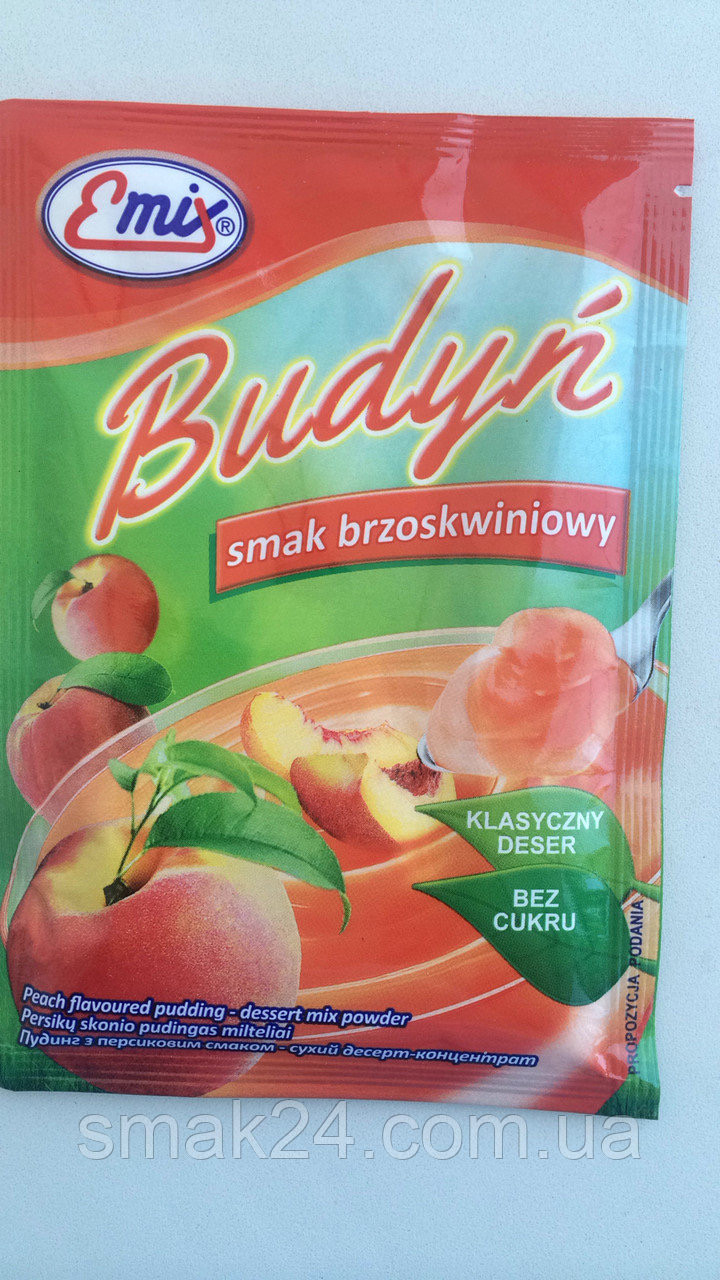 Пудинг зі смаком Персика Emix Budyn Польща 40 г Дуже простий у приготуванні. Після приготування вживають як солодкий десерт, а також використовують як прошарок і прикраса для тортів, пирогів і т. д.