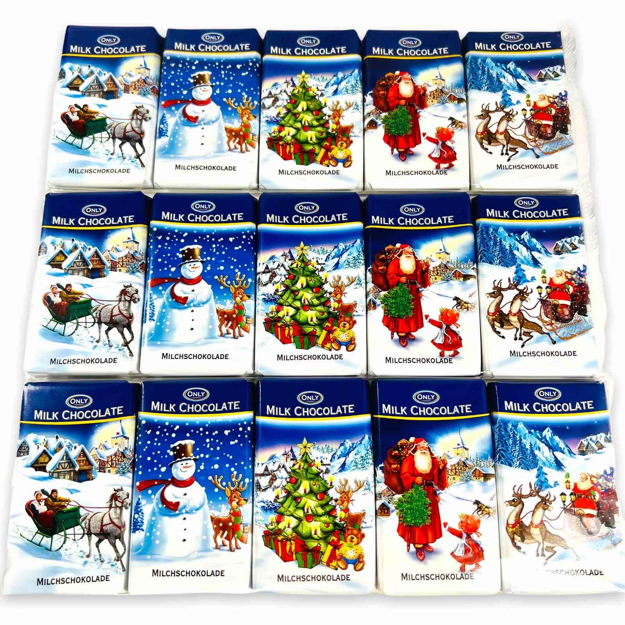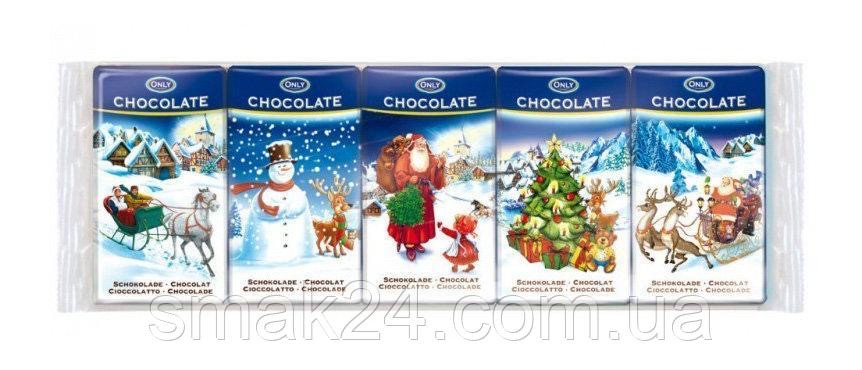 Різдвяний набір мінішоколадок Only (5 шт.х15г) 75г Австрія 5 молочних міні-солодок у гарній обгортці на дитячу тематику з мультяшками. Какао-маса: мінімум 30%. Шоколад Only- чудовий спосіб додати ідеальний штрих до будь-якого подарунку