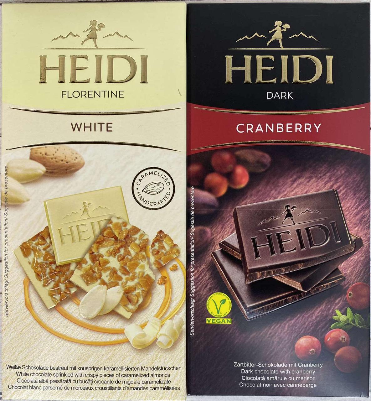 Шоколад (2 шт.) з карамелізованим шаром мигдалю Florentine 100 г і темний із журавлиною 80 г Heidi Румунія Понад 25 років тому відомий і пристрасний швейцарський шоколтьє заснував компанію HEIDI, передавши секретне мистецтво створення шоколаду. Назва компанії була натхненна маленькою дівчинкою з історії Джоанна Спайрі, яка завжди побачила світлий бік життя. Сьогодні HEIDI залишається шоколадом, який надихає смачними поєднаннями та сильним позитивним посланням. Зірковий склад — шар мигдальних пластівців у карамельному сиропі та білому шоколаді! Спробуйте дивовижне поєднання делікатного та хрусткого смаку. Виготовлено за французькою рецептом 17-го століття, створеною на честь флорентійської королеви Катерини Медічі.