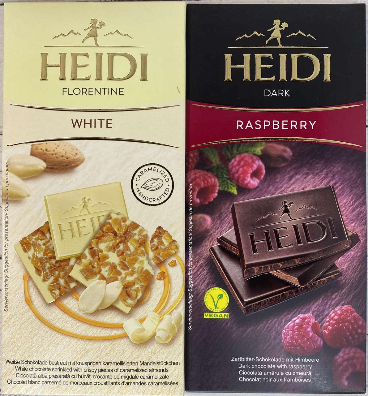 Шоколад (2 шт.) з карамелізованим шаром мигдалю Florentine 100 г і темний з Малиною 80 г Heidi Румунія Понад 25 років тому відомий і пристрасний швейцарський шоколтьє заснував компанію HEIDI, передавши секретне мистецтво створення шоколаду. Назва компанії була натхненна маленькою дівчинкою з історії Джоанна Спайрі, яка завжди побачила світлий бік життя. Сьогодні HEIDI залишається шоколадом, який надихає смачними поєднаннями та сильним позитивним посланням. Зірковий склад — шар мигдальних пластівців у карамельному сиропі та білому шоколаді! Спробуйте дивовижне поєднання делікатного та хрусткого смаку. Виготовлено за французькою рецептом 17-го століття, створеною на честь флорентійської королеви Катерини Медічі.