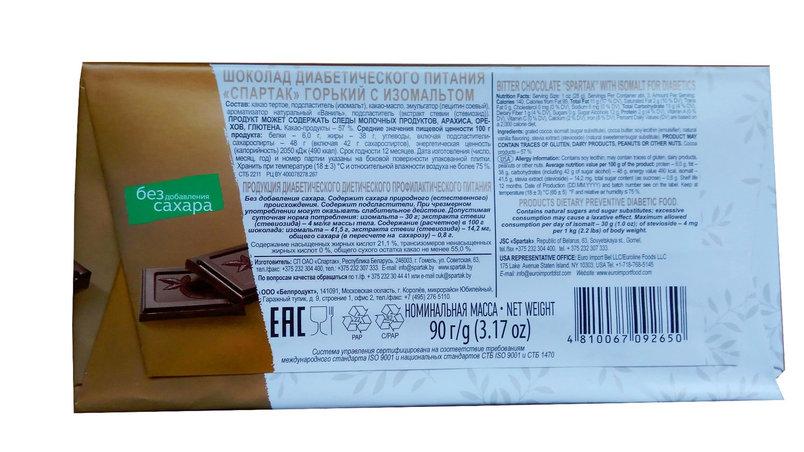 Шоколад діабетичний «Спартак» гіркий із ізомальтом Білорусь 90 г Опис Призначений для діабетичного харчування хворих на цукровий діабет. Діабетичний шоколад. Вміст 100 г продукту: ізомальта — 42 г, какаопродуктів — 57% Харчова цінність на 100 г Белки6 г. Жиры38 г. Вуглеводи48 г. Енергетична цінність 500 ккал. Вес90 г. Срок годности12 мес.
