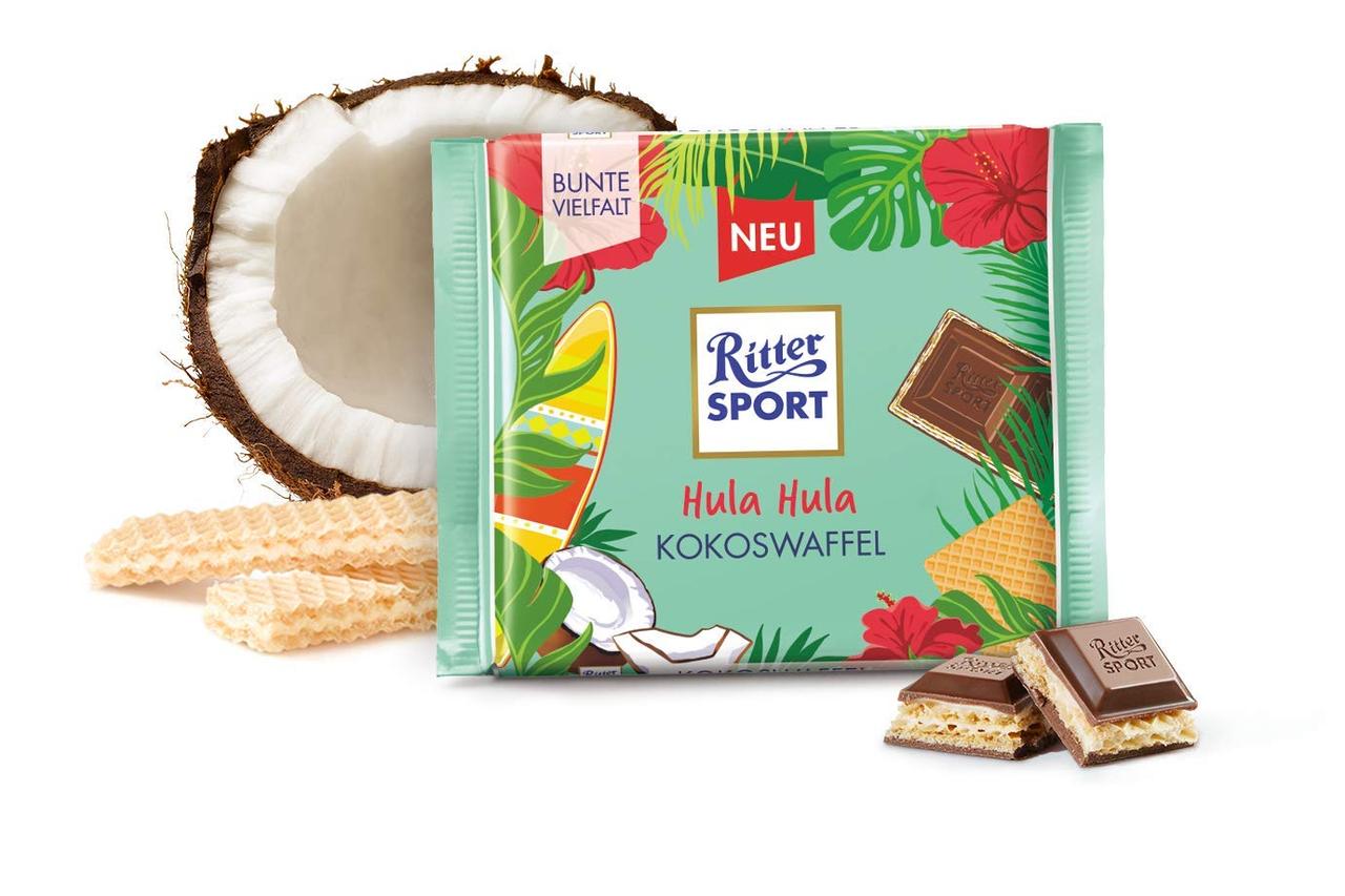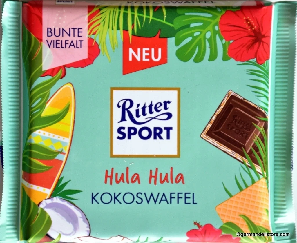 Шоколад Кокосова вафля Ritter Sport Hula Hula Kokoswaffel 100г Німеччина Шоколад Ritter Sport Coconut – натуральний молочний шоколад з наповненням з кокосової начинки і вафель. Для виготовлення шоколаду Ritter Sport використовуються какао-боби тільки високої якості, які виростають в Західній Африці. В процесі виробництва молочного шоколаду відбирається високоякісну сировину з додаванням добірного сухого молока. Завдяки ретельному відбору інгредієнтів для приготування Ritter Sport Kokoswaffel, молочний шоколад може носити ім’я цього шедевра.