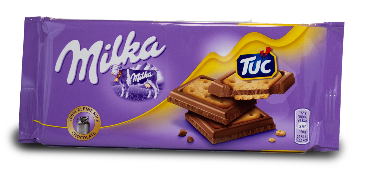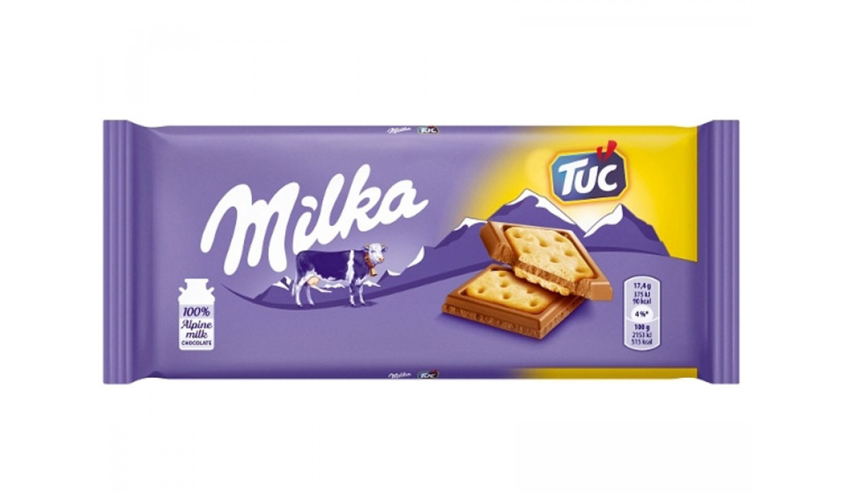 Шоколад молочний Milka TUC Швейцарія 87г Шоколад Milka із солоним крекером Тук — незвичайний сендвіч із хрусткого солоного крекера Тук із прошарком із ніжного молочного шоколаду Milka. Смачна спілка, що руйнує стереотипи, дарує нові смакові відчуття і будить творчу фантазію. Незрівнянний смак молочного шоколаду Milka із солоним крекером Тук здатний перенести в чарівну країну, де завжди бездонне блакитне небо, яскраве сонце, чисті струмки, зелена трава та бузкові мрії.
