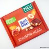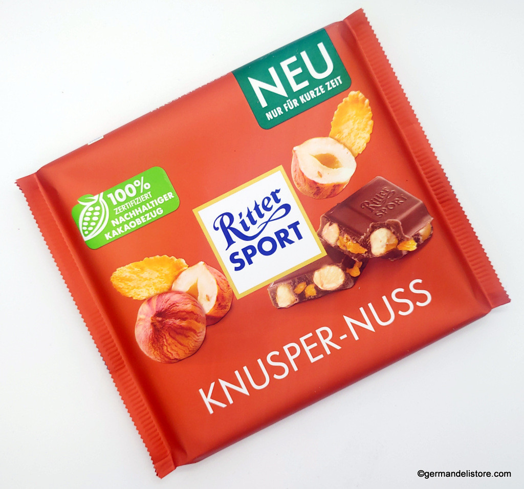 Шоколад Ritter sport Knusper-Nuss 100г Німеччина Молочний шоколад із цілими лісовими горіхами (15%) та кукурудзяними пластівцями (5%). Поєднання цілих хрустких лісових горіхів та хрустких кукурудзяних пластівців у молочному шоколаді забезпечує гучний смак. Рекомендації щодо зберігання: Берегти від тепла та вологи. Список інгредієнтів: цукор, фундук, олія какао, какао терта, суцільне сухе молоко, лактоза, кукурудза, сухе знежирене молоко, вершковий жир, емульгатор: лецитини (соя), сіль, екстракт ячмінного солоду. Може містити сліди арахісу, інших горіхів та яєць. Сертифікат rainforest alliance.