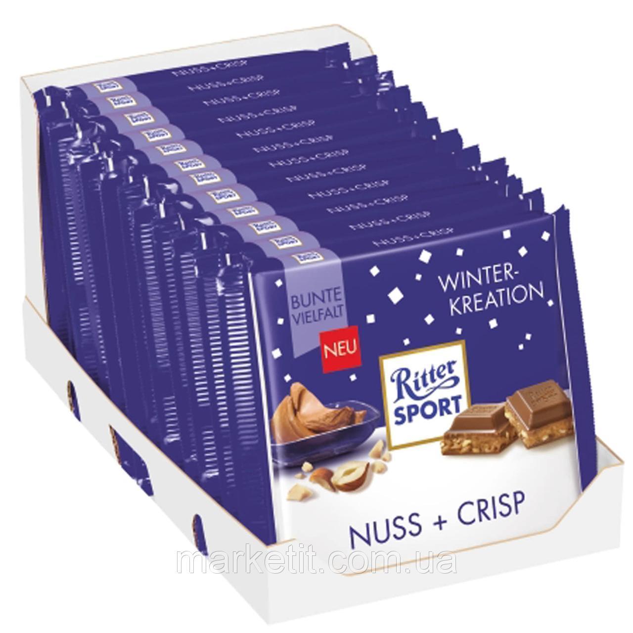 НОВИНКА!!! Ritter Sport Nuss + Crisp Winter Kreatіon – поєднує в собі апетитне горіхове праліне і хрусткі шматочки подрібненого фундука, укладені в оболонку з ніжного молочного крему і хрусткого шоколад RITTER SPORT. Його смак так заворожує!