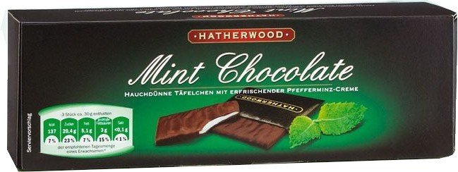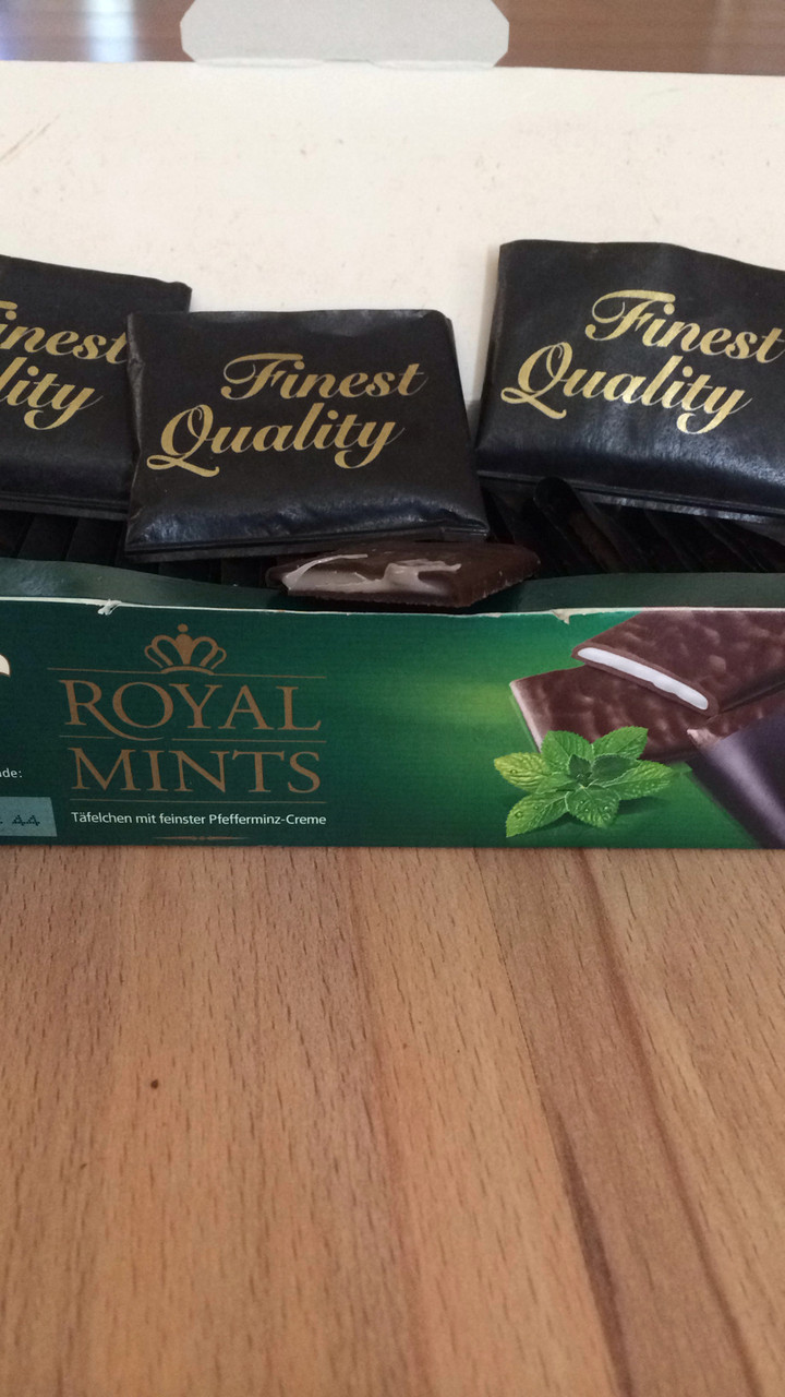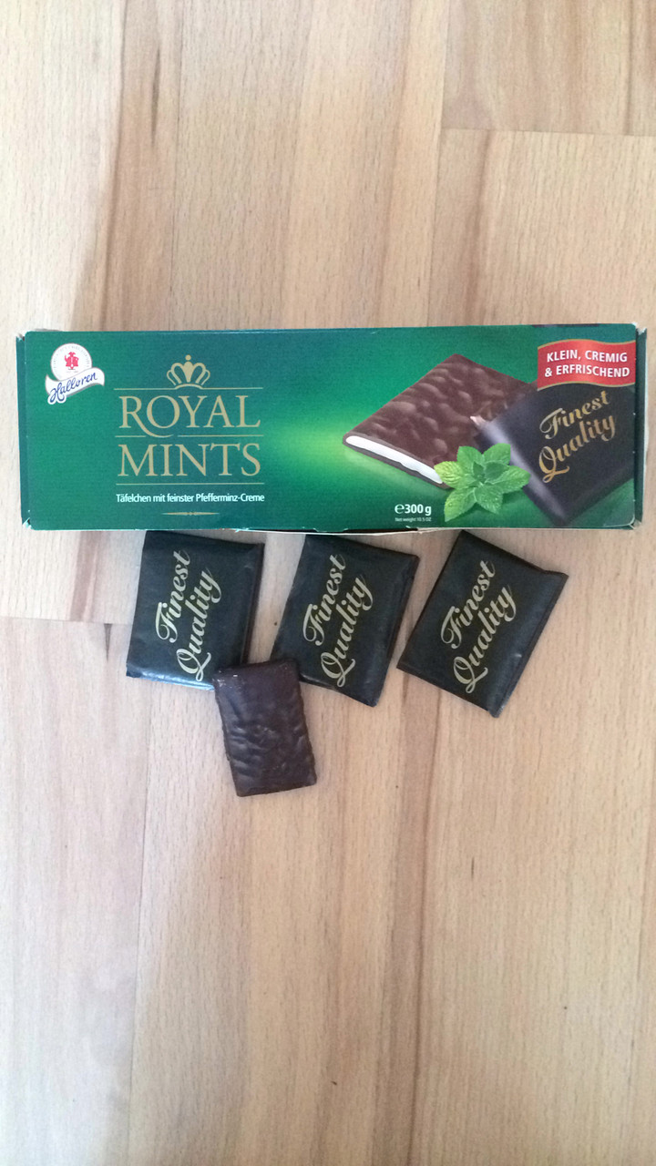 Королівський Шоколад Німеччина 300г з найніжнішої прошарком м’яти. Всередині упаковки знаходиться 30 шоколадних пластинок, кожна з яких знаходиться (упакована) в конвертику.