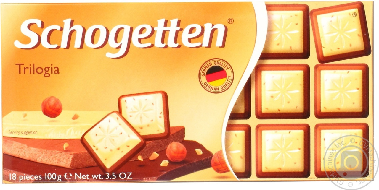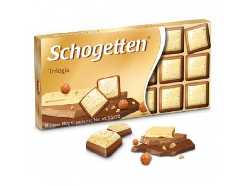 нижній шар — молочний шоколад середній — молочний шоколад із джандією й лісовими горіхами верхний — білий шоколад із грильяжем і лісовими горіхами Білий шоколад із грильяжем і лісовими горіхами, молочний шоколад із джандуєю та лісовими горіхами, молочний шоколад Schogetten Trilogia — натуральний шоколад, який відповідає всім нормам і стандартам німецької якості. Неперевершений смак! Бажаємо гарного настрою!