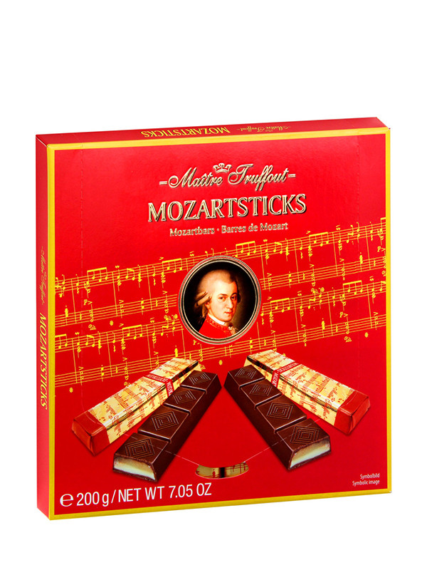 Шоколад темний у стиках Mozartsticks Maitre Truffout – начинка складається з тонко підібраної комбінації марципана з мигдалем і фісташками, а також шару нуги з фундуком. Багатий смак шоколаду розкривається гармонійним поєднанням темного шоколаду, марципана та нуги, у яких є виразні відтінки фісташок, мигдалю та фундука. Побалуйте себе та своїх близьких. Цукерки виготовлені у формі невеликих прямокутних плиточок, розділених на маленькі квадратики. Завдяки цьому такою цукеркою можна запросто поділитися з близькими. Як частування ці цукерки підійдуть прекрасно. Вони ідеально завершать будь-яку фуршет або святкову вечерю. До таких цукерок можна подати чашку гарячого чаю або кави, а також келих сухого червоного вина. Ці цукерки можна вважати унікальними, адже вони будуть доречними і на світських бесідах, і на чаюванні з дрізами, і для усамітнення біля каміна. Цукерки виробляються компанією Maitre Truffout, яка широко відома не тільки в рідній Австрії, але й у багатьох інших країнах світу. Вся продукція компанії виготовляється на основі якісних інгредієнтів і за суворого контролю виробників. Все це робиться для того, щоб у результаті отримати розкішний десерт.