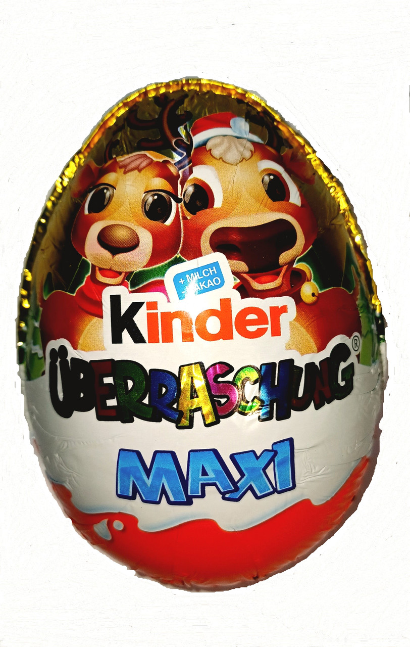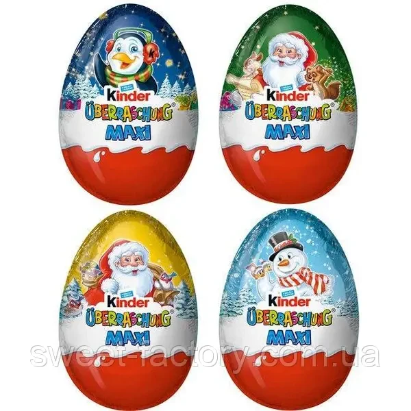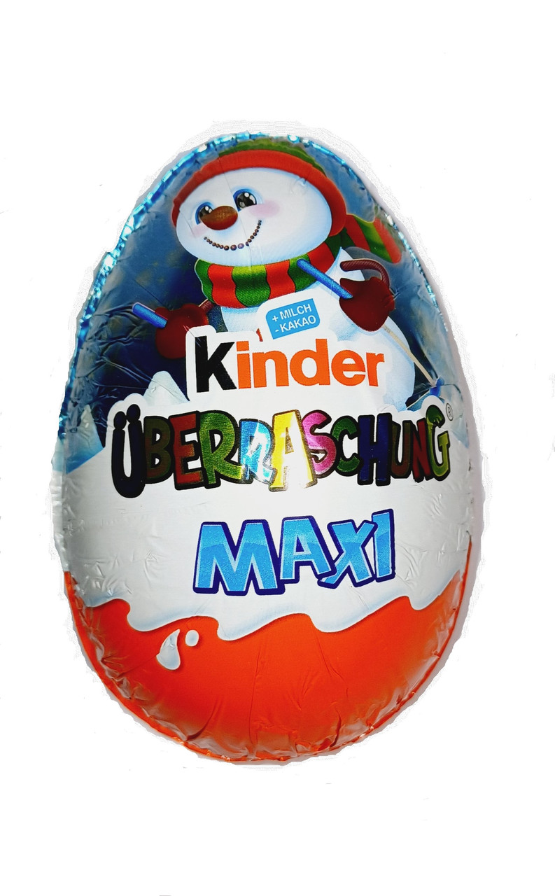 Шоколадне яйце Kinder Uberraschung Maxi 100 г Німеччина Яйця Kinder несподівано стали культовими впродовж 40 років. Яйця Kinder Uberraschung Maxi в новорічному дизайні захоплюють як молодих, так і літніх людей своїм делікатним таянням шоколаду з цільного молока та молочного шоколаду, а також сюрпризом усередині. Дизайн товару може відрізнятися від зображення.