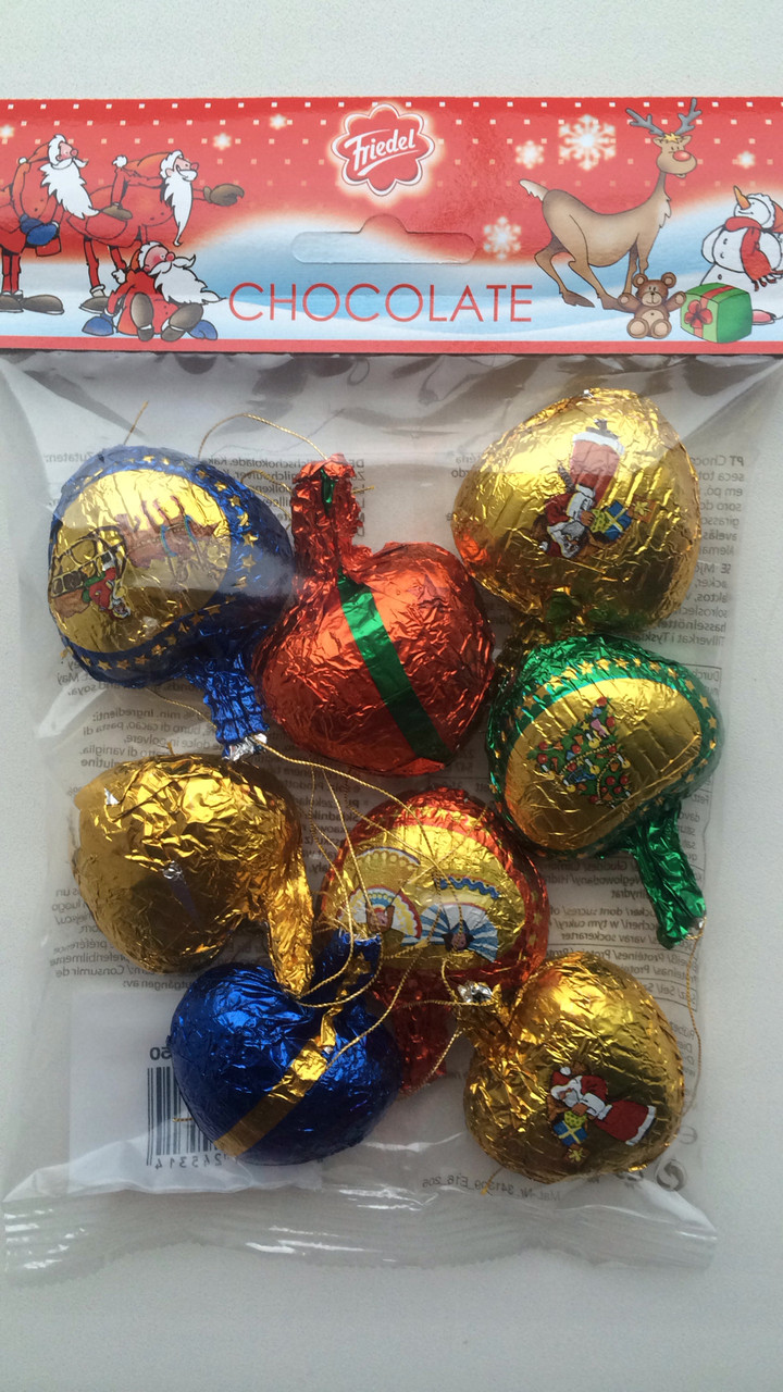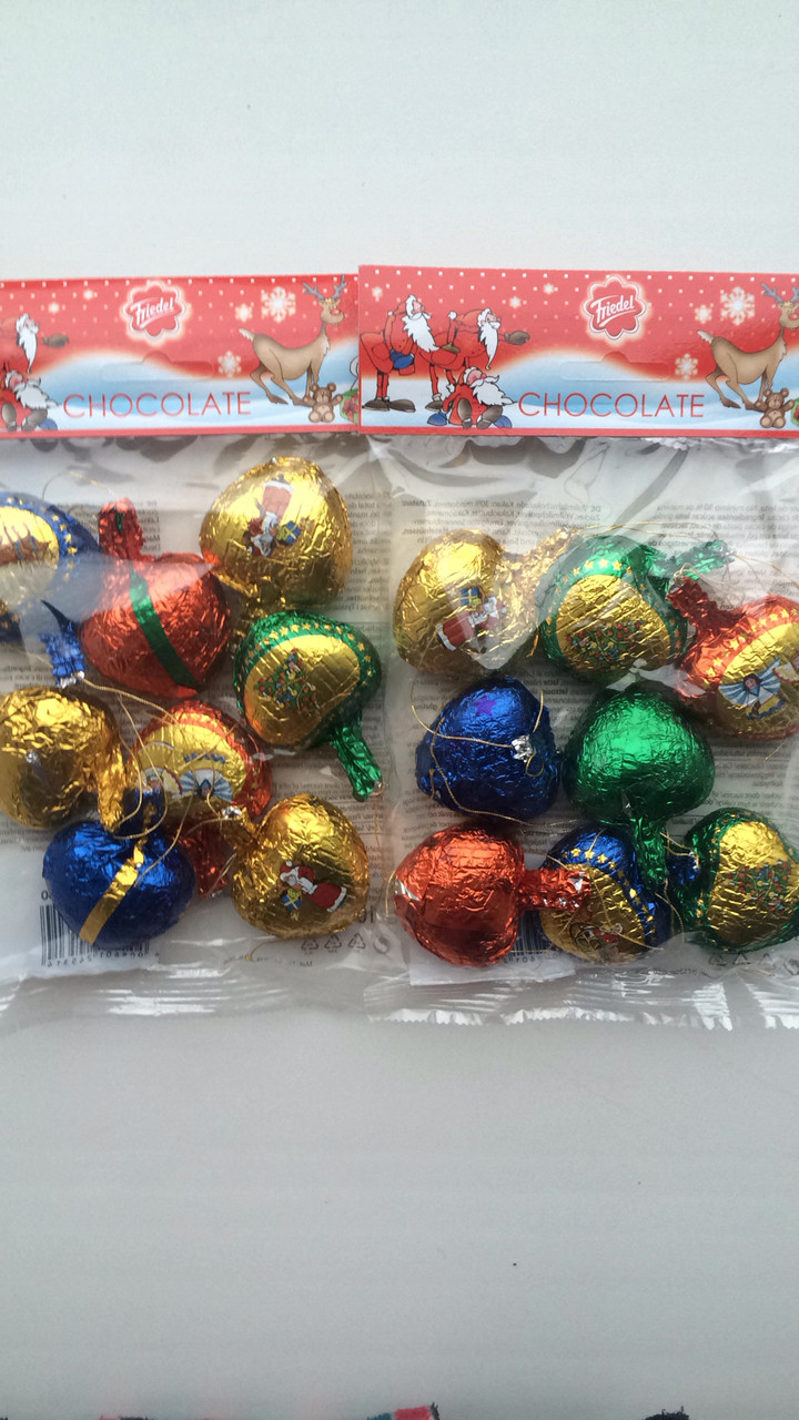 Набір шоколадних іграшок – прекрасна прикраса, а головне, що їх можна діткам з’їсти. У наборі 8 шоколадних іграшок у формі сердечок ( 6см*6см) загорнутих в блискучу фольгу, на якій зображені ялинка, Миколай на санях з оленями,янголята і т. д. і все це в одній упаковці.